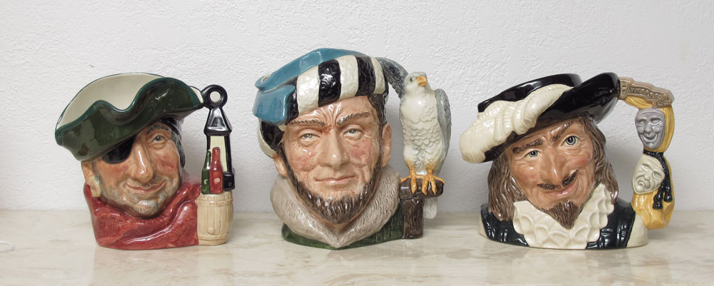 3 ROYAL DOULTON CHARACTER JUGS: 1) SMUGGLER D6616, 6 1/2'';c 2) THE FALCONER D6533, 8''; 3) SCARAMOUCHE D6774, Special Edition of 1500, 6 1/2''.