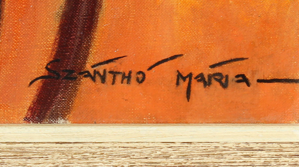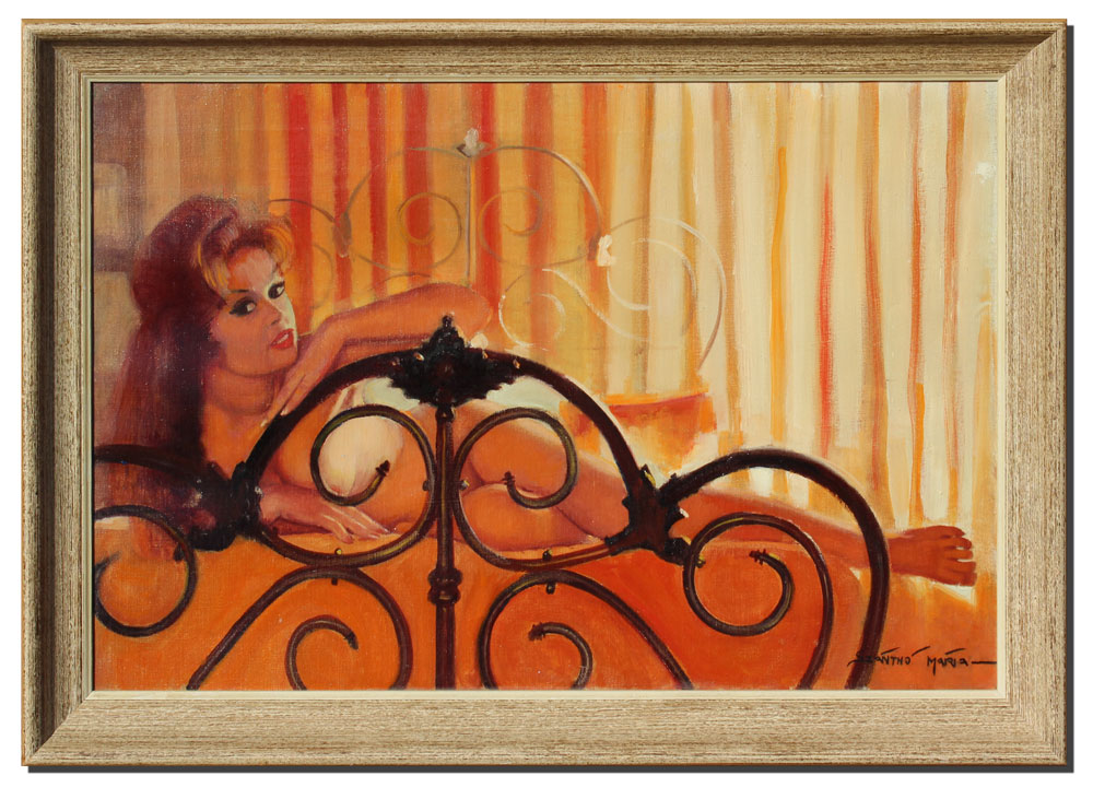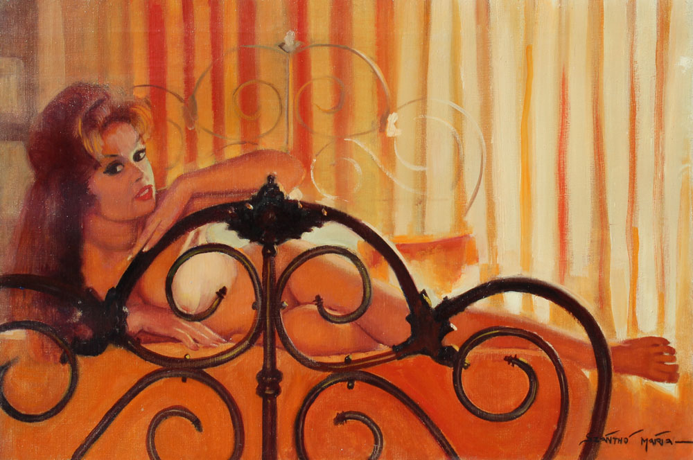 SZANTHO, Maria, (Hungarian, 1898-1984): Mature Red-Headed Female Nude Reclining on a Cast Iron Bed, Oil/Canvas, 16'' x 24'', signed lower right Szantho Maria, painted frame, 19'' x 26 1/2''.