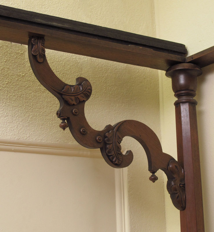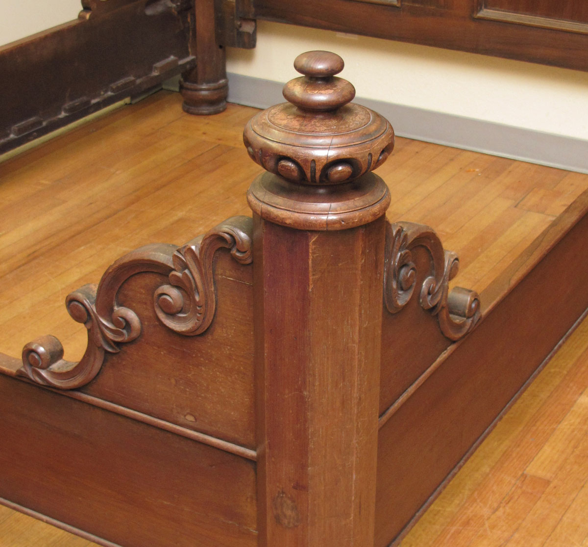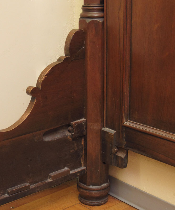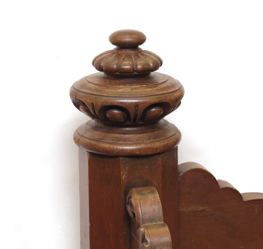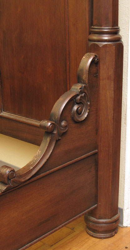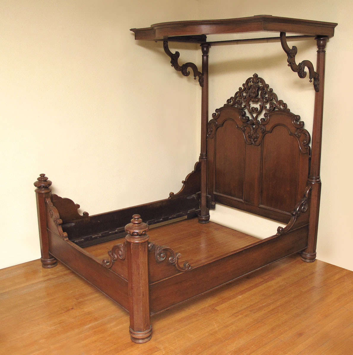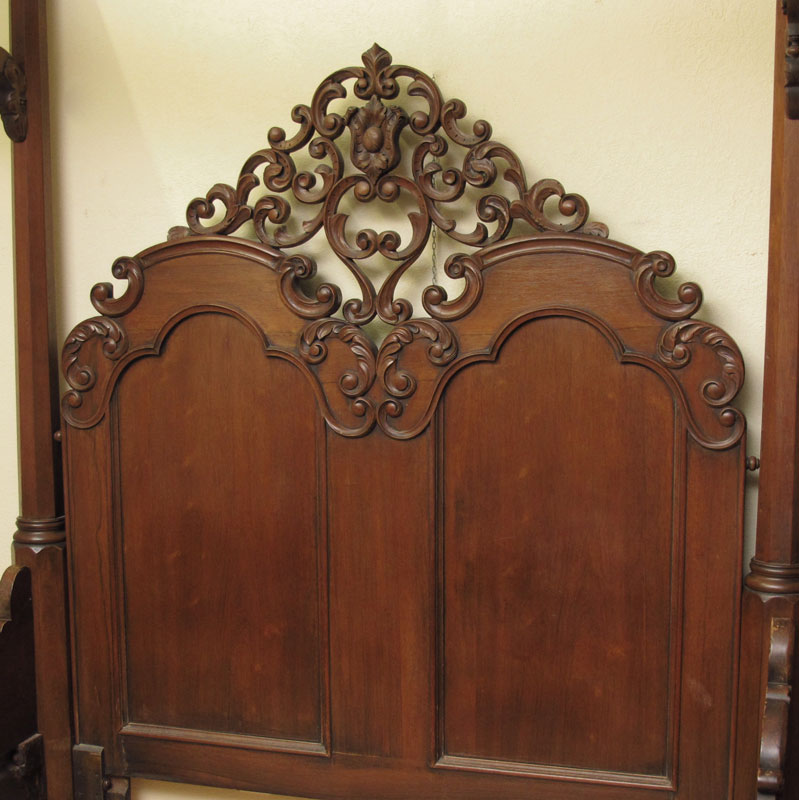 MASSIVE VICTORIAN CARVED WALNUT HALF TESTER BED: Shaped top, carved and shaped supports for top. Carved and open scroll work headboard, carved decoration to rails and foot board. Approx. 96'' h. x 91'' x 79''. Will hold a 85'' x 65'' mattress.