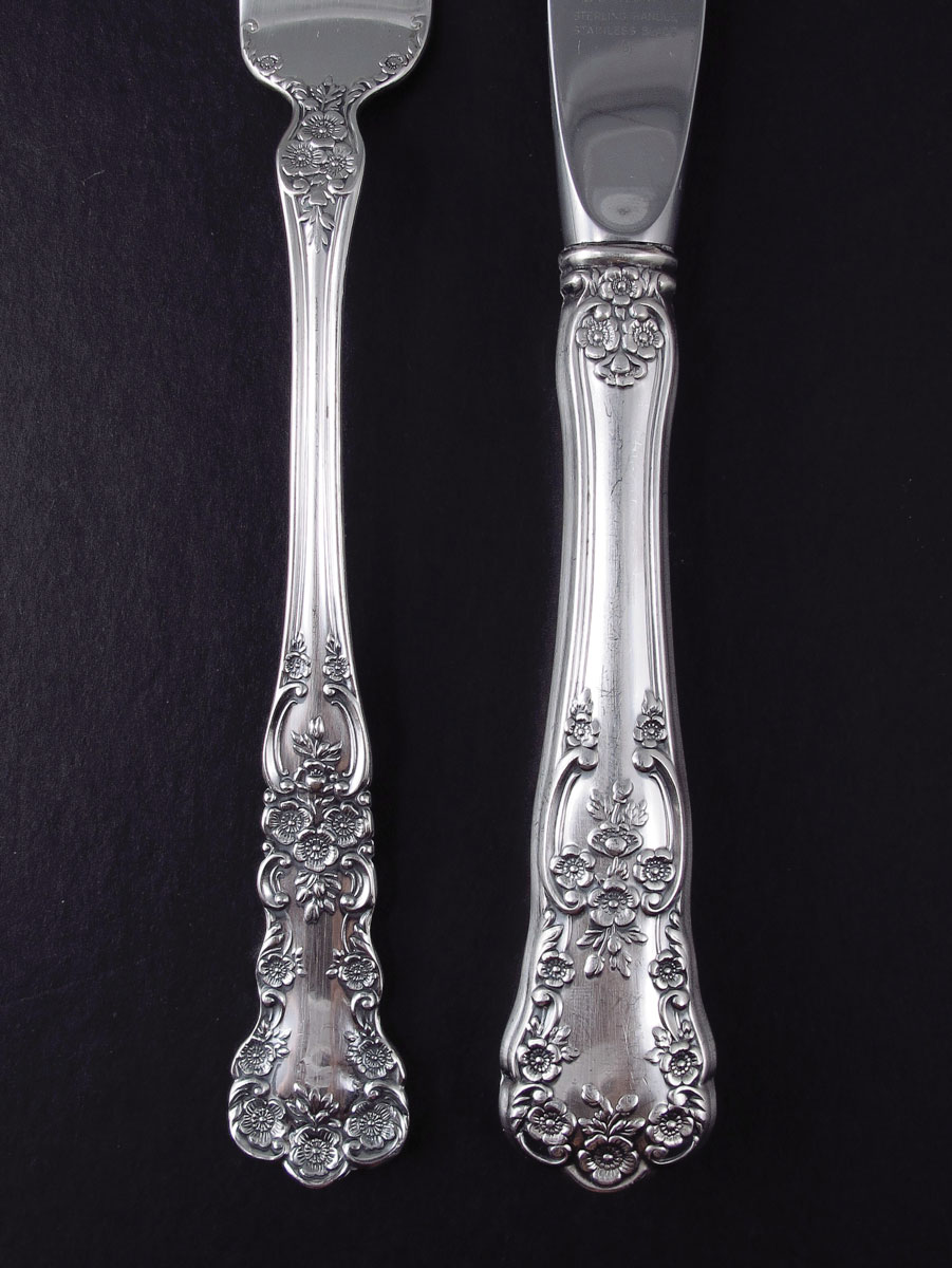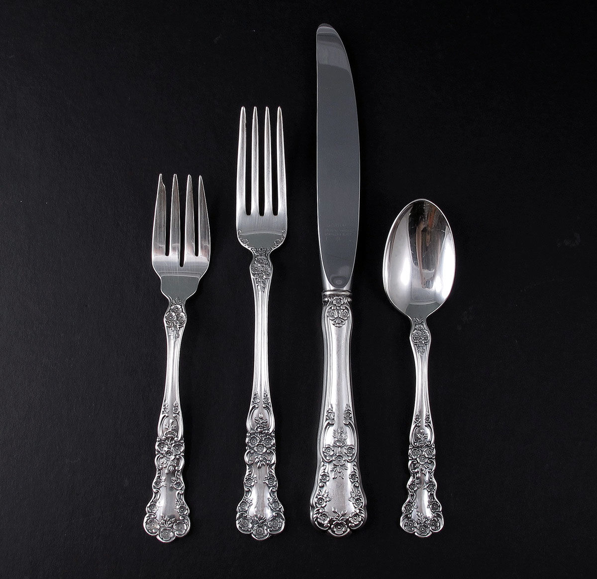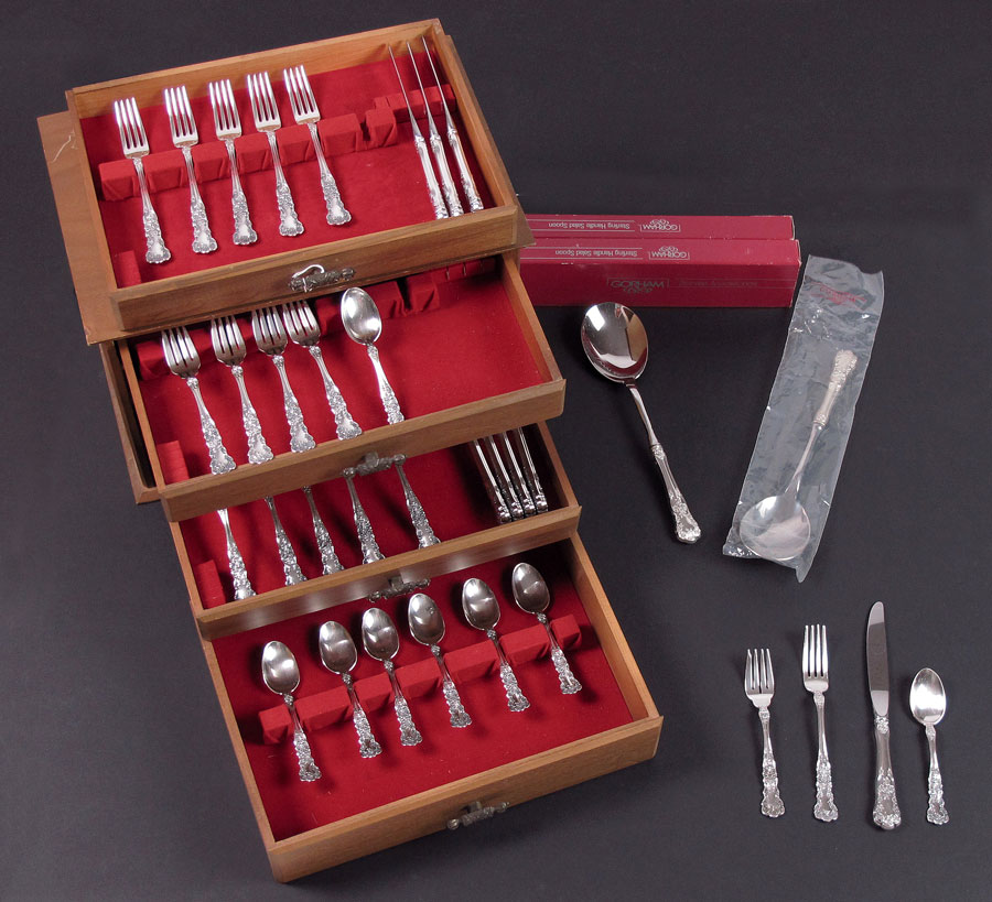 GORHAM BUTTERCUP STERLING FLATWARE SERVICE: Approx. 34 pieces in the Buttercup pattern by Gorham to include 8 forks (7 1/2''), 8 salad forks (6 1/4''), 8 teaspoons (5 3/4''), 8 hollow knives (9 1/8''), 2 salad spoons in original packaging (11 1/4''). Sold with 4 drawer silver chest 10'' h. x 15 5/8'' x 11''. Approx. 36.6 troy oz.