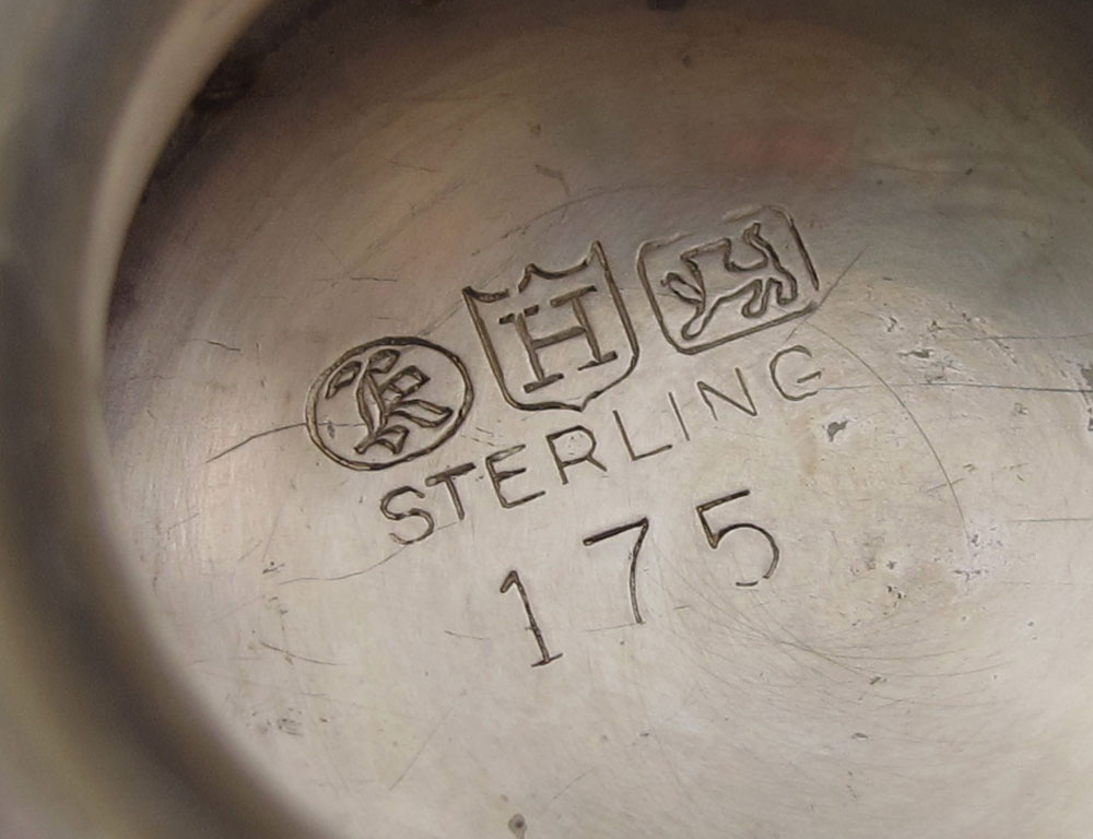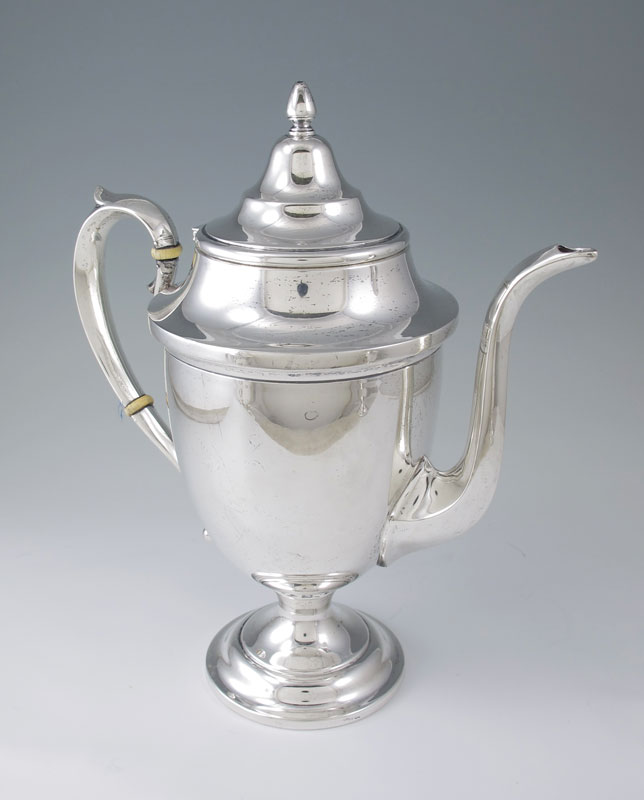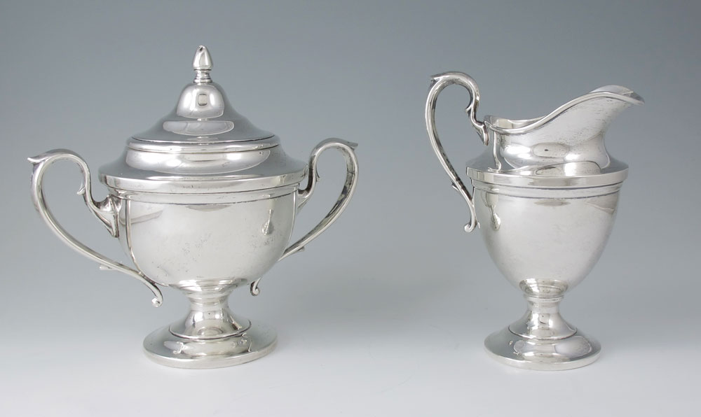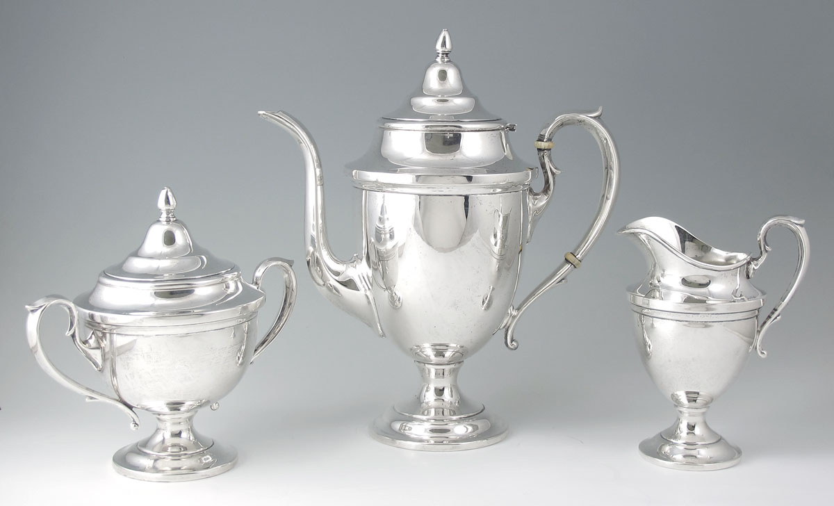 HUNT SILVER CO. 3 PIECE STERLING COFFEE SERVICE: To include 1) Coffee pot with hinged lid, bone heat shields. 10 3/4'' h. x 10''. 2) Covered sugar, 7'' h. x 7 3/4''. 3) Open creamer, 6'' x 4 1/2''. Approx. 42.1 troy oz.