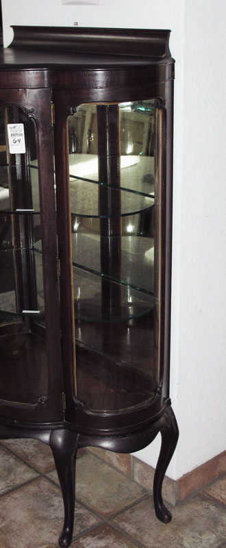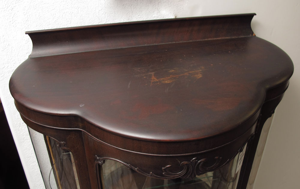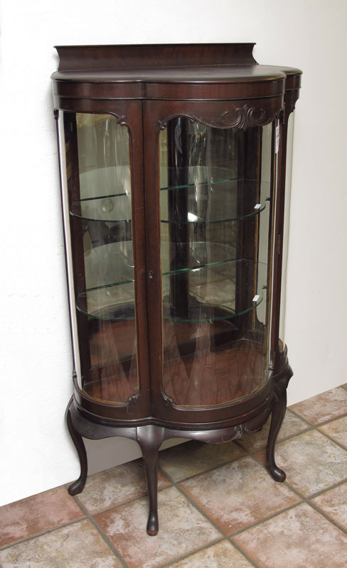 DIMINUTIVE MAHOGANY SERPENTINE FRONT CURIO DISPLAY CABINET: Glass serpentine front and bowed sides with carved decoration to door frame, 2 interior glass shelves, mirrored back. Carved decoration to shaped skirt, on 4 shaped legs. Measures 54'' h. x 30'' x 17 1/2''.