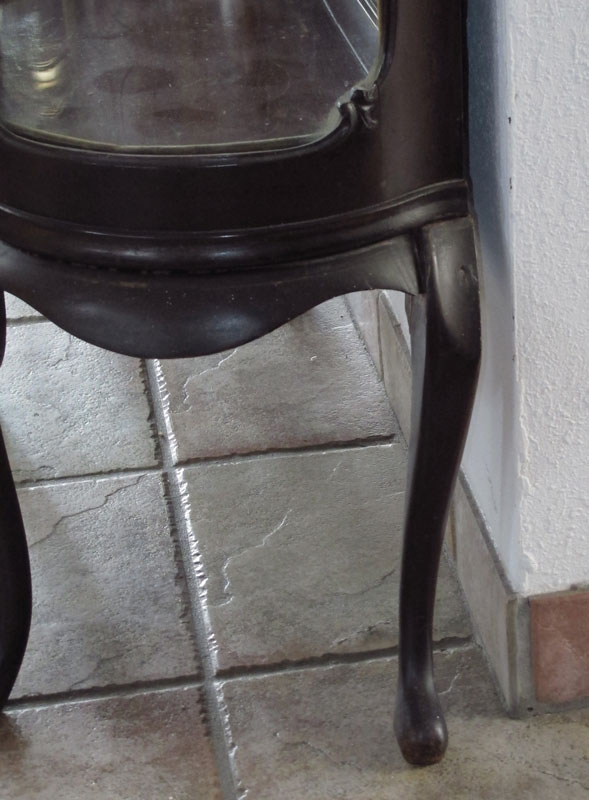 CONDITION: Note uneven finish, scratches to top, chip to gallery, minor chips to glass shelves.