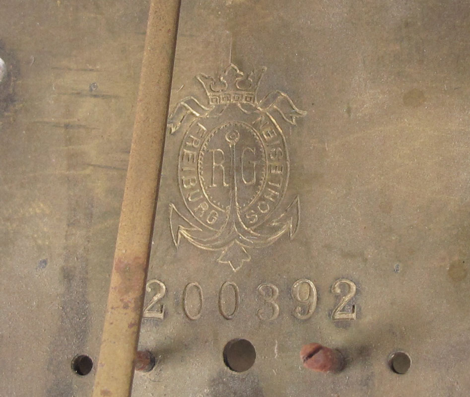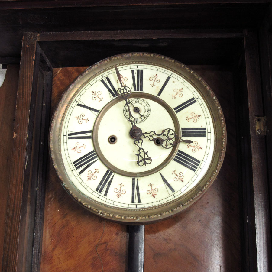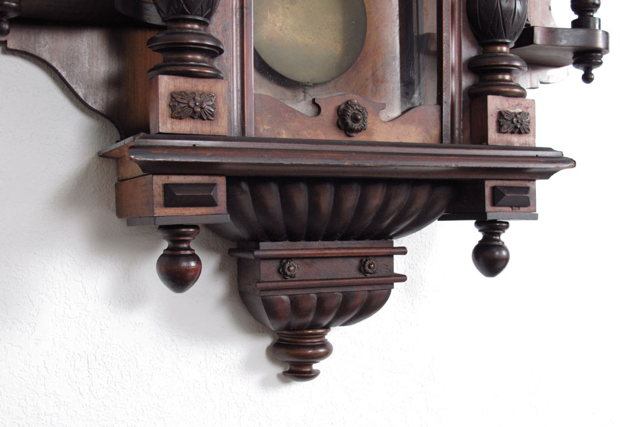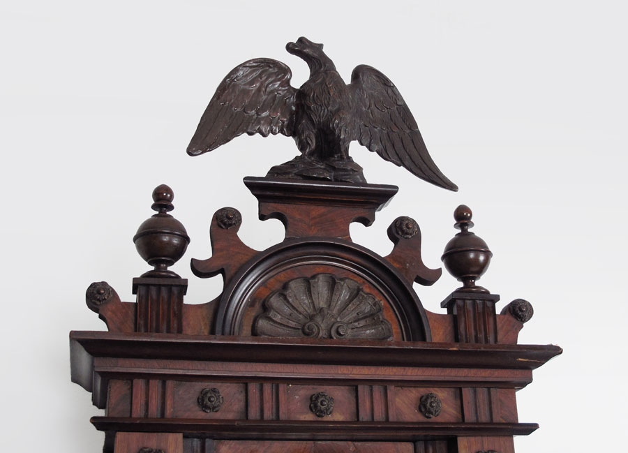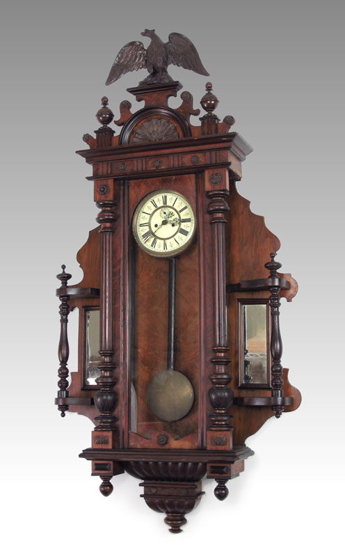 RESCH GEBRUDER CARVED VIENNA REGULATOR CLOCK: Eagle finial over carved crest with applied decoration. Body with applied decoration and half columns. Removable side wings with 2 shelves and mirror. Resch Gebruder dual weight time and strike movement. Porcelain face with Roman numerals. Measures approx. 55'' h. x 30'' x 6 1/2'' overall.