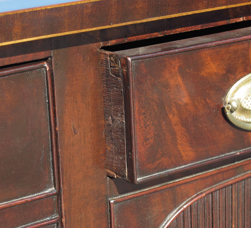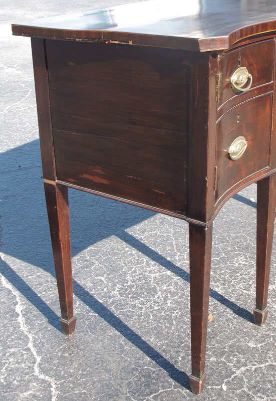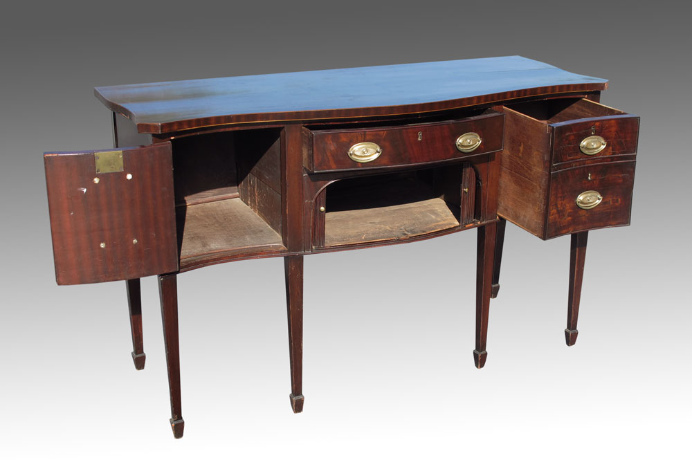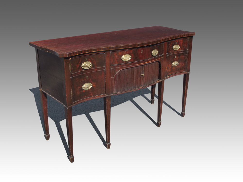 19th C ENGLISH GEORGIAN 6 LEGGED SIDEBOARD: String inlay, slightly bow front shaped top. Central long drawer over tambour flanked by cellaret drawer on one side and door on the other. 6 tapered legs. 37'' h. x 60'' x 22 1/4''.