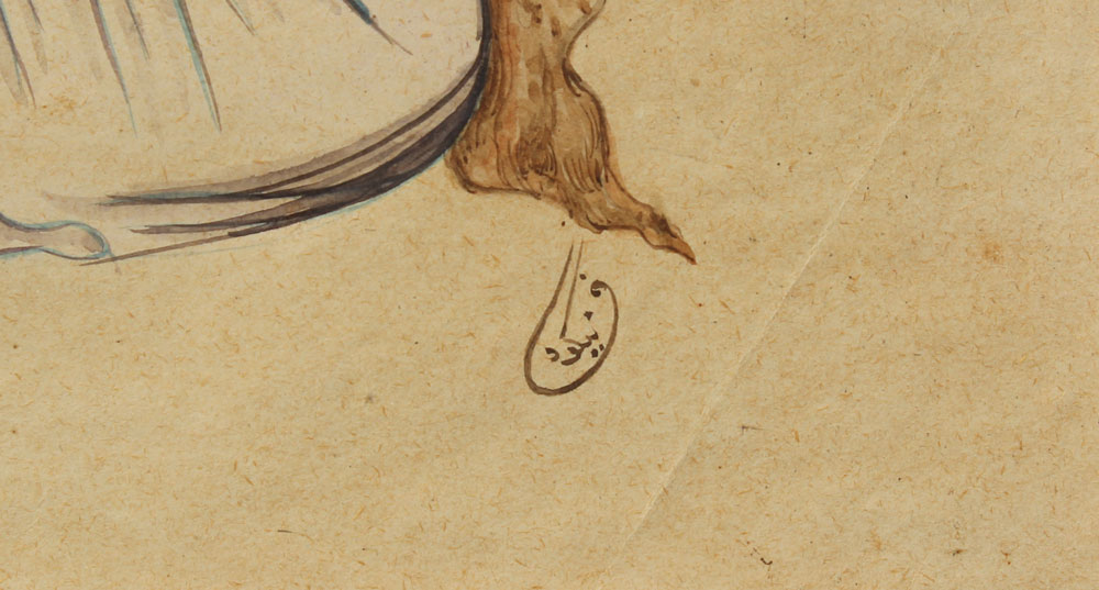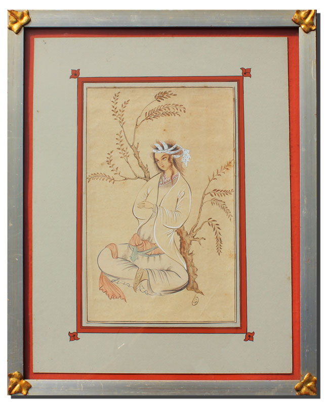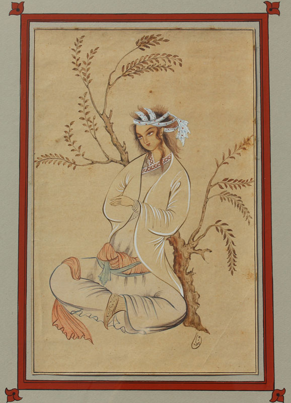 NINETEENTH CENTURY? PERSIAN WATERCOLOR OF A SEATED FIGURE: Float-mounted size 13'' x 8 1/2'', possible signature in the lower right, encased in a later frame, 21 1/2'' x 17 1/2''.