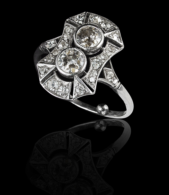 1920's PLATINUM DIAMOND FILIGREE RING: Art Deco platinum ring with 2 Old European round cut diamonds, and 14 round single cut diamonds, all totaling approx. 1.00 Ct. and averaging VS-SI in clarity and H-I color. Bezel and bead set. Size 6. Weight: 3.8 grams. Sold with current Atlanta Gemological GIA graduates appraisal for $3,350.