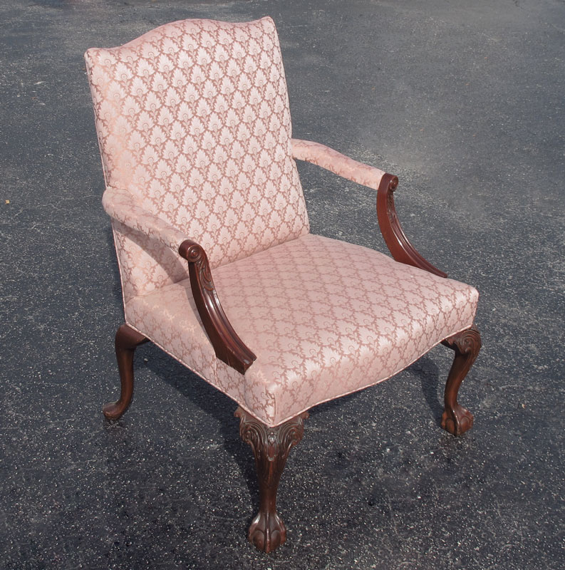 EARLY 20TH C CHIPPENDALE STYLE LOLLING CHAIR: Ball and claw front legs, newer upholstery. 41''h. x 29'' x 26''.