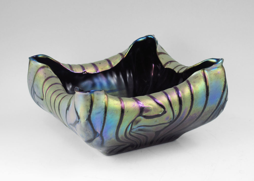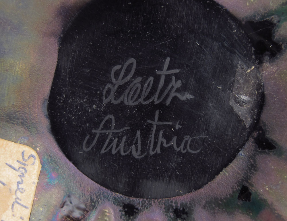 KRALIK IRIDESCENT ART GLASS DISH: Dark purple with iridescent exterior having dark purple ribs, 4'' tall, 7 3/8'' dia. Signed with spurious ''Loetz Austria'' signature,