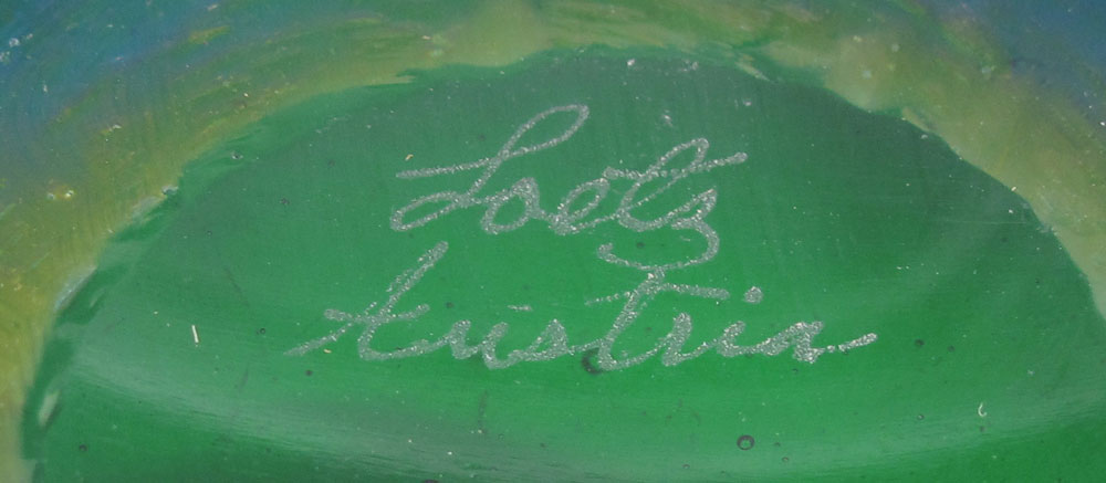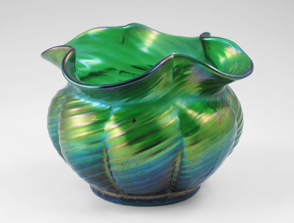 SIGNED LOETZ MELON RIBBED VASE: Melon ribbed, green iridescent glass. 5'' x 6.5'' dia. Signed ''Loetz Austria''.