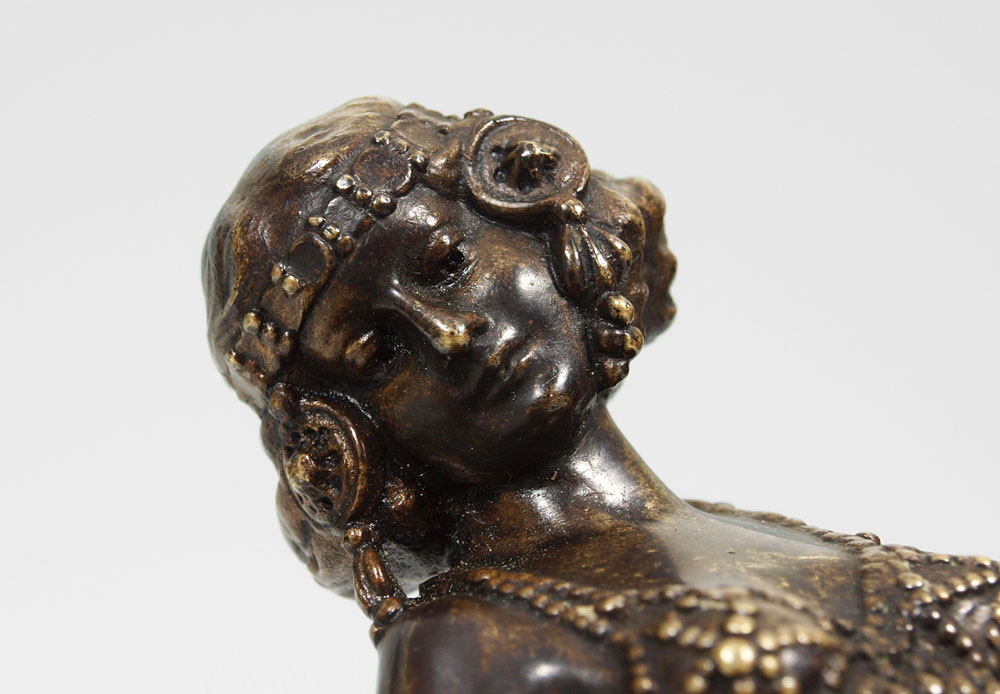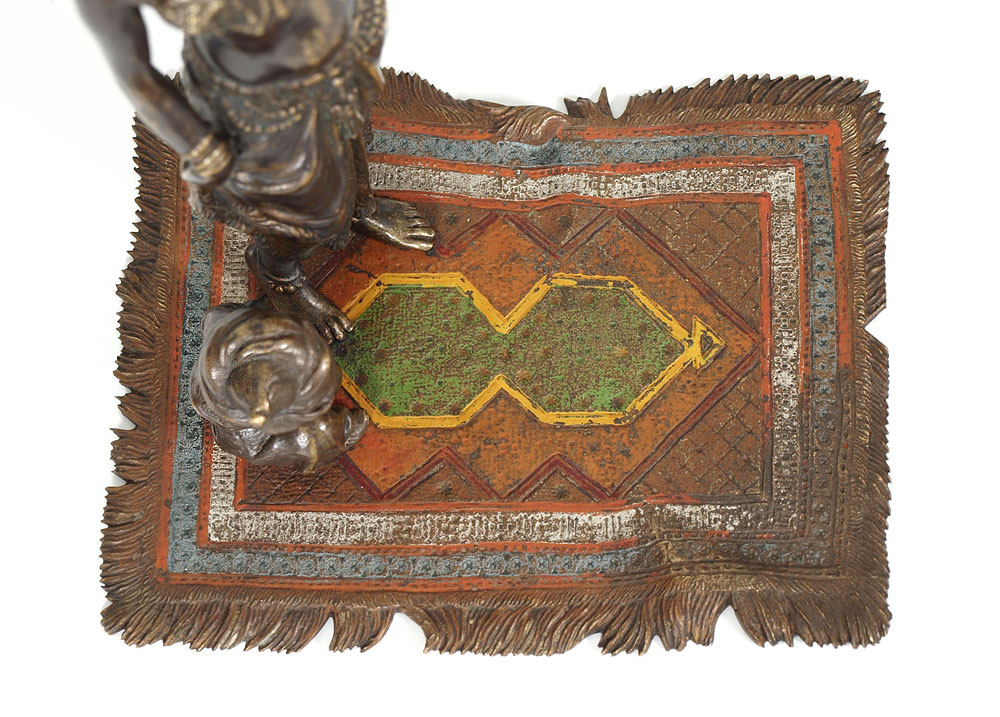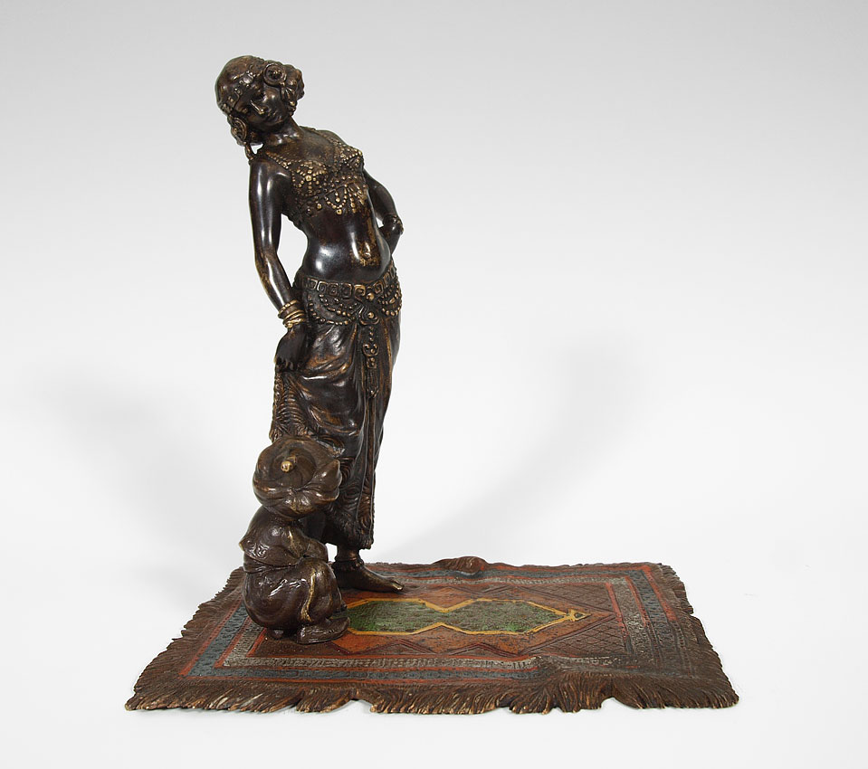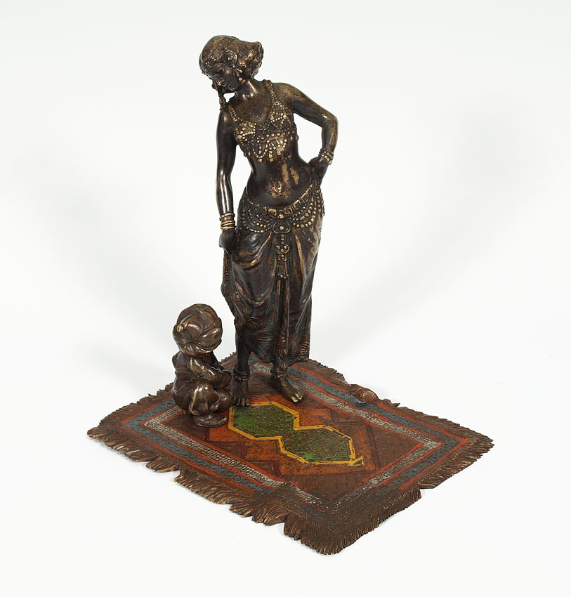BERGMAN AUSTRIAN BRONZE ORIENTALIST FIGURE: Franz Xavier Bergman (1861-1936). Scantily clad woman with child attendant, both on a cold painted carpet. Impressed B in vase mark, 6 1/4'' tall x 5 1/2'' x 4 1/4''.