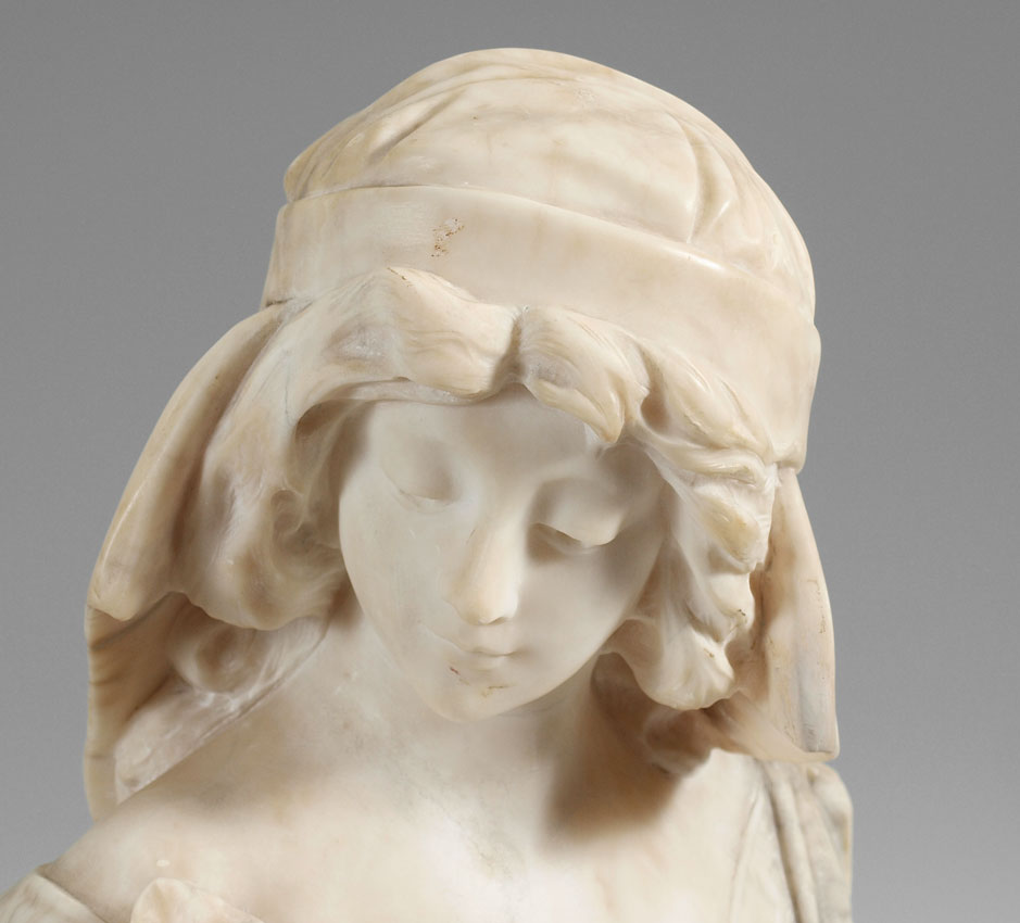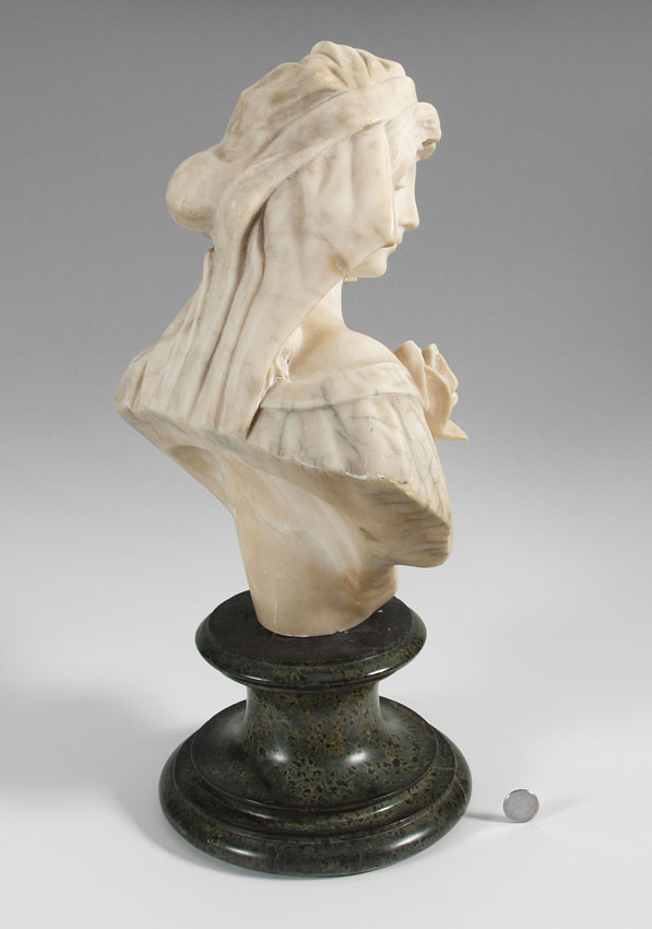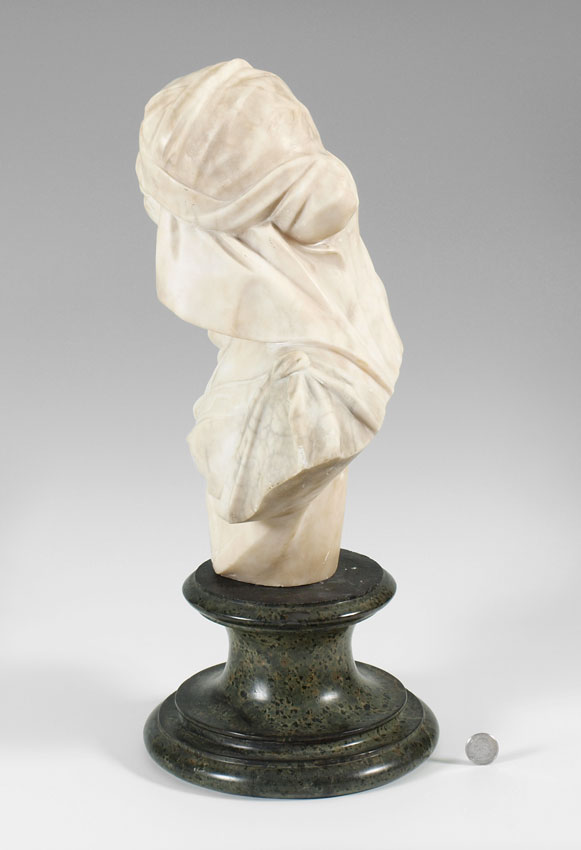 CIPRIANI, (Italian): Torso Length Sculpture of a Maiden, Marble, incised signature verso, affixed to polished green marble plinth with several minor chips, 5 1/2'' h.