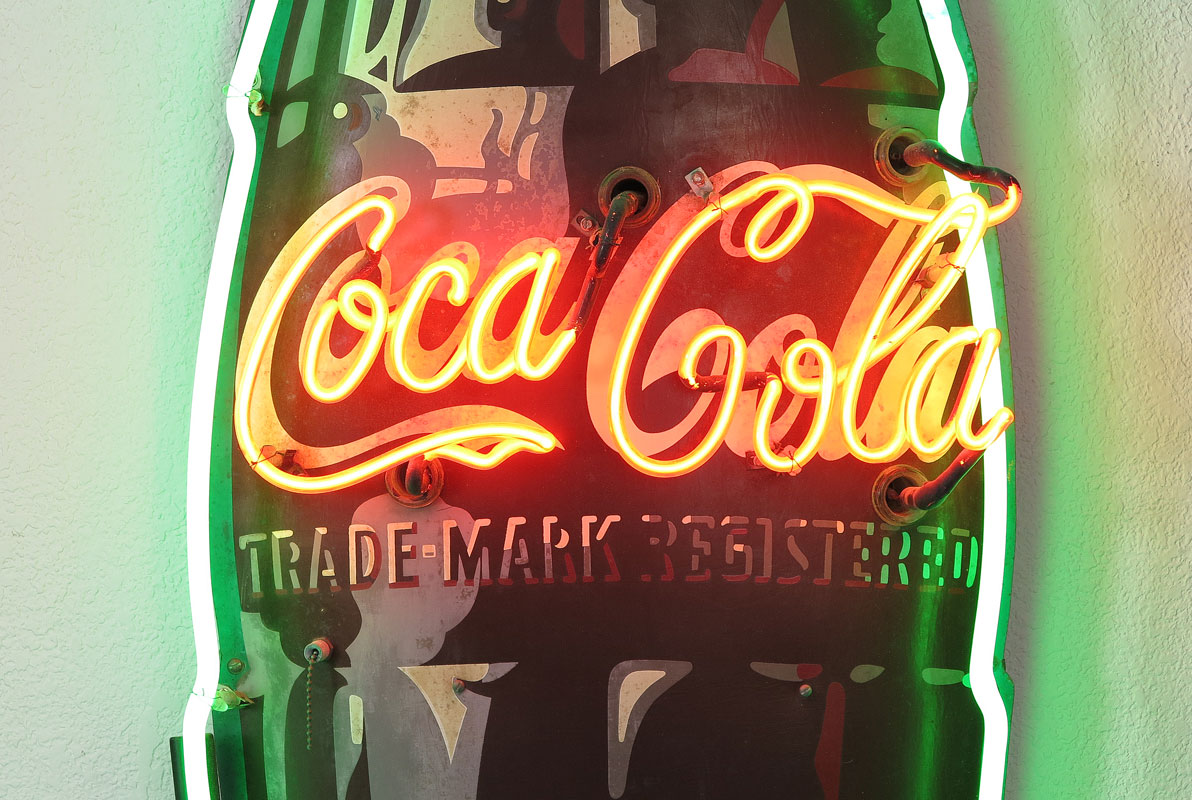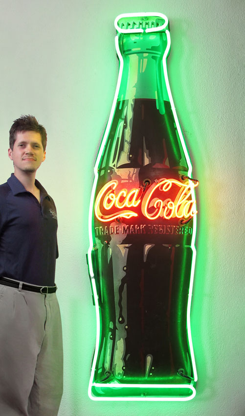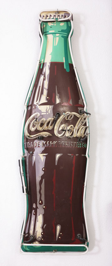 1950'S LARGE COCA COLA NEON BOTTLE WALL SIGN: Circa 1950's painted tin advertising sign, die cut in the shape of a bottle with added neon. Paint appears to be all original, marked on bottom FM99. Measures approx. 72'' h. x 21'' x 6''.