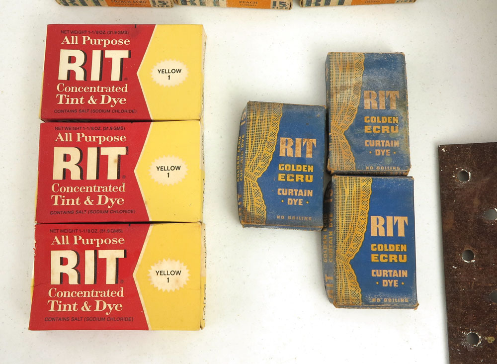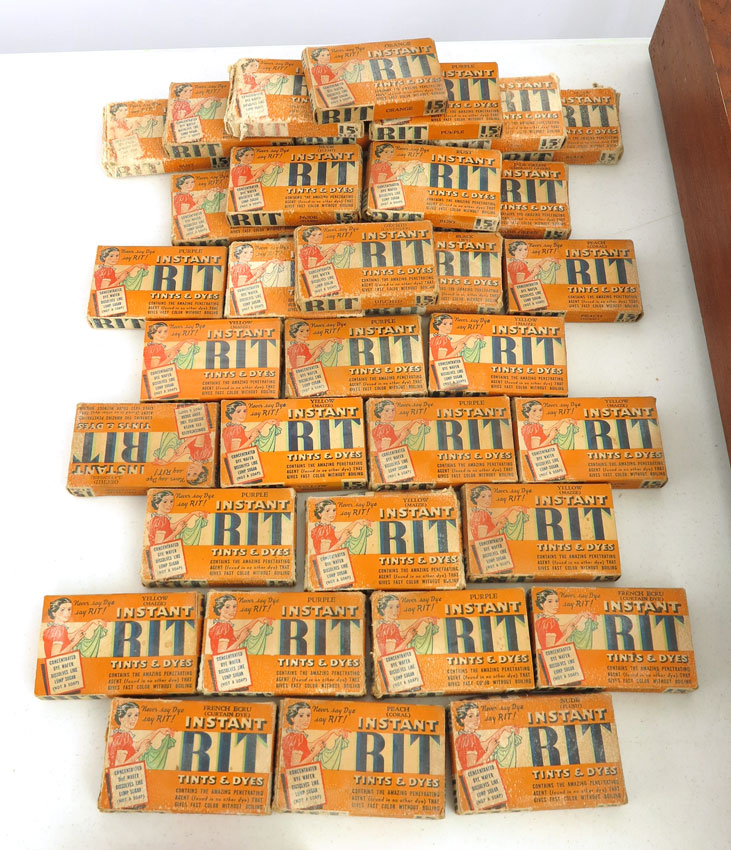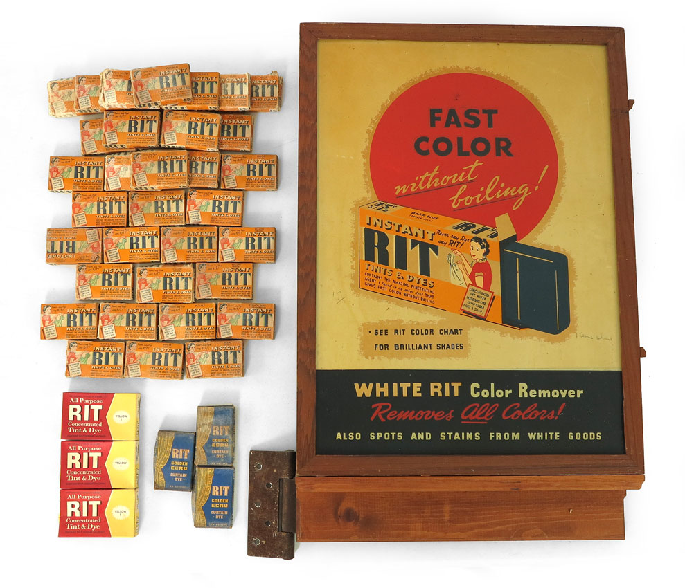 RIT DYE ADVERTISING WALL CABINET: Front lithograph panel advertising RIT dyes and tints, sold with approx. 38 dye packets in original boxes. Mounts to wall with single hinges on lower left corner. Measures 28 1/2'' x 17 3/4'' x 3 1/4''.