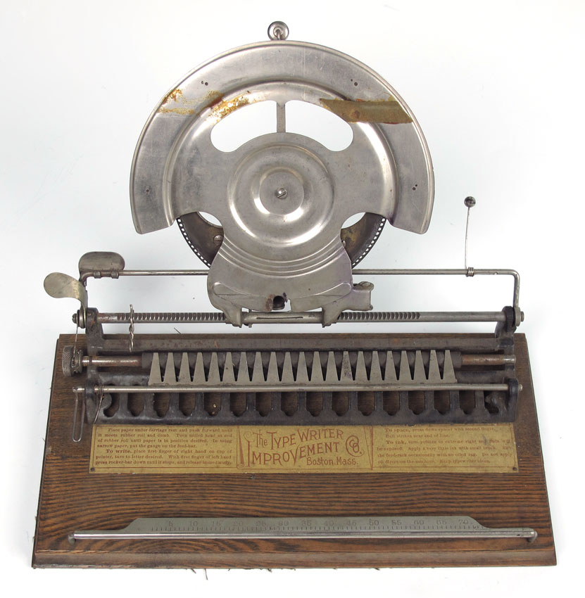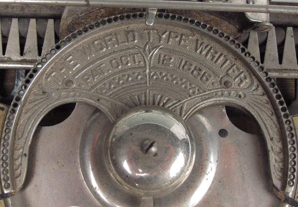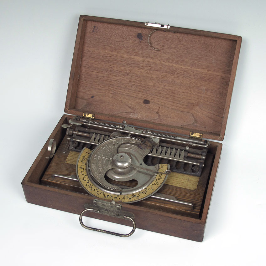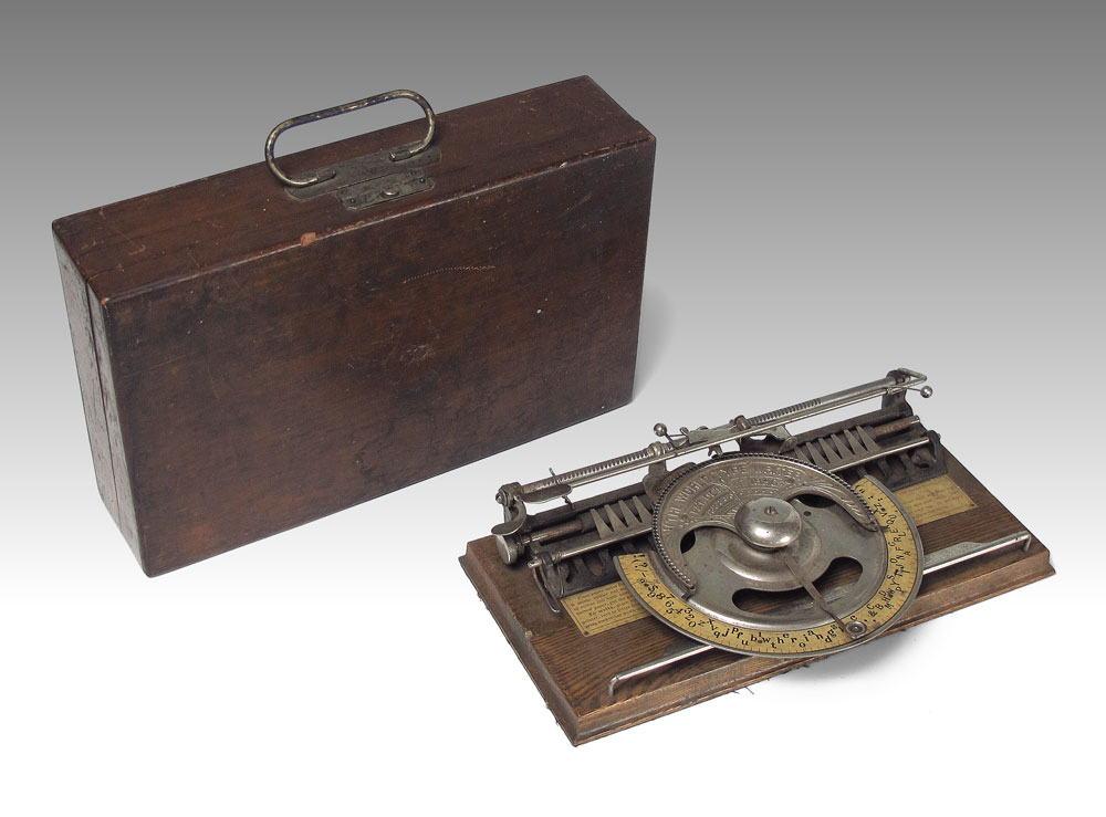 THE WORLD TYPE WRITER IN ORIGINAL CASE: Manufactured by the Typewriter Improvement Company. Index wheel type typewriter, original instruction plaque inside. In the original case. Case measures 3 1/4'' x 13'' x 8''.