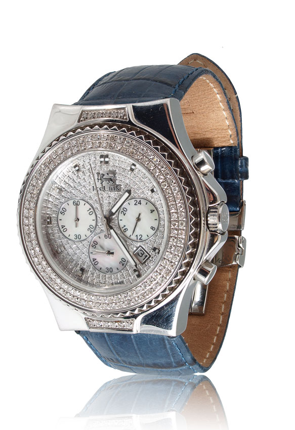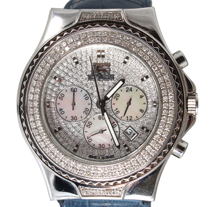 ICELINK MARVEL DIAMOND WRISTWATCH: Stainless steel and approx. 2.5 ctw of diamonds on the bezel and dial, model 1136. The movement is a Miyota chronograph model OS20. Original buckle double deployment blue leather strap is signed Icelink. Diameter of case is 43mm. Running order.