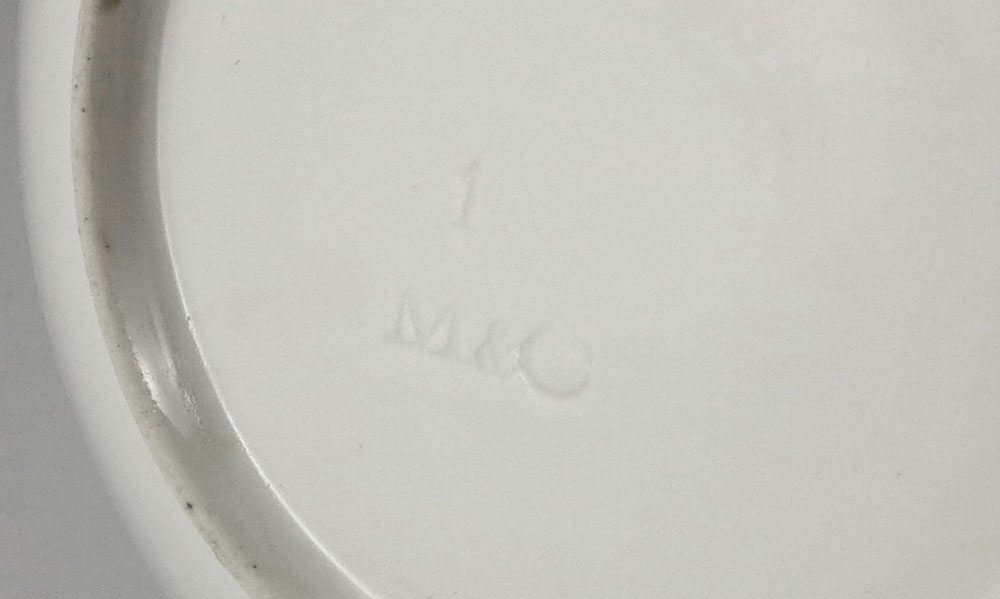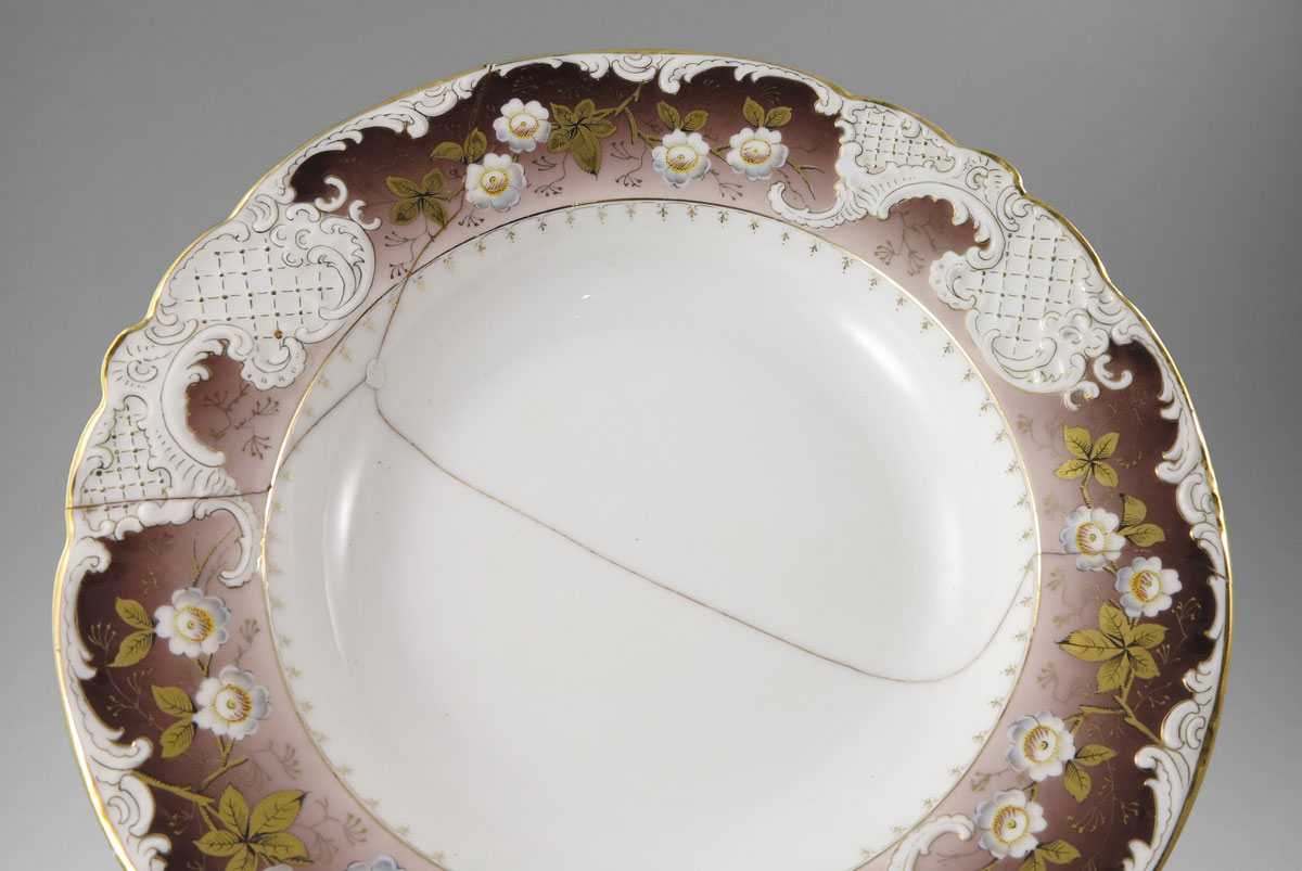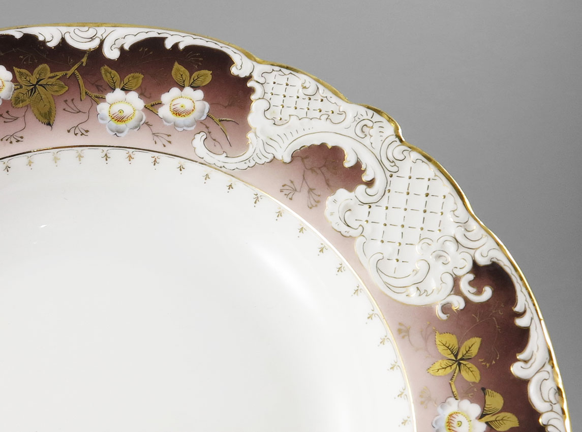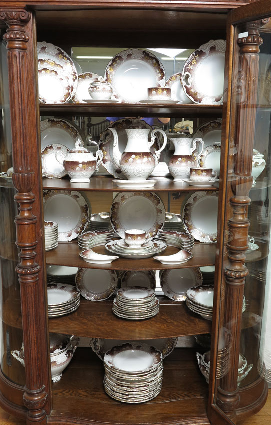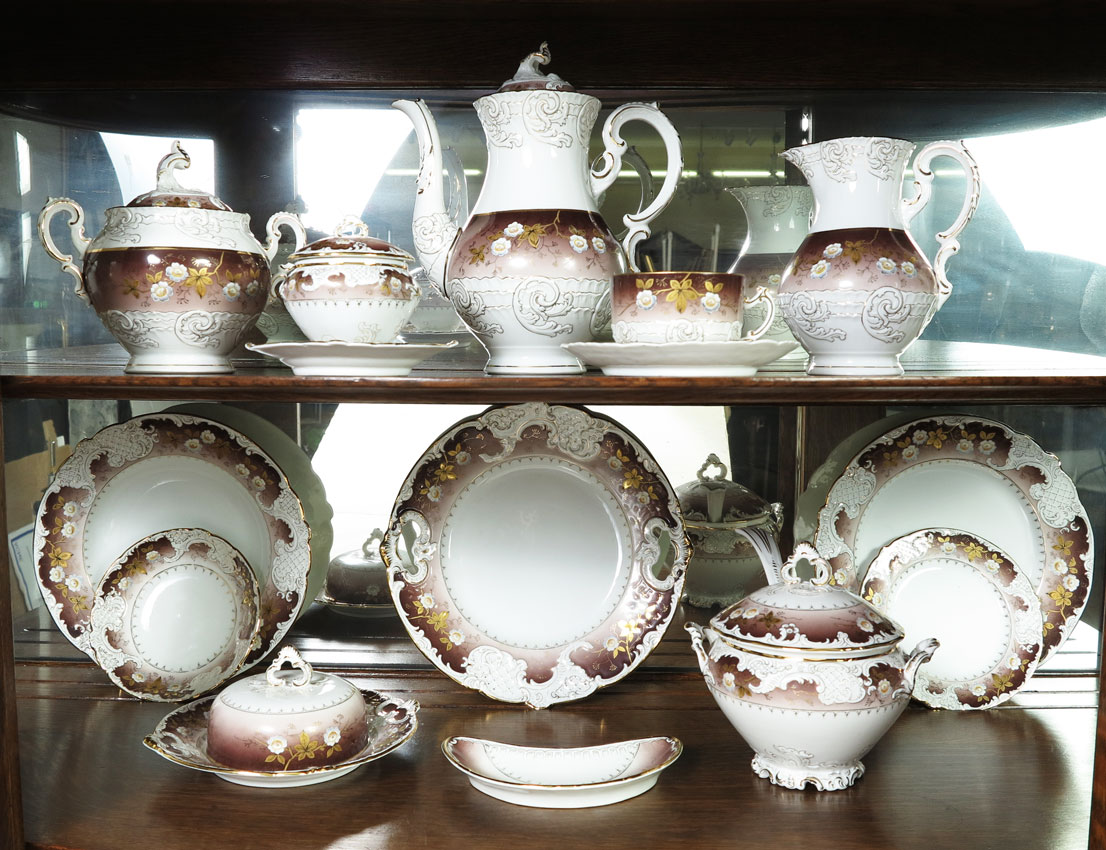 95 PIECE ARTHUR MAIER DINNER SERVICE: This service represents one of only 2 services made in this pattern by Arthur Maier's porcelain factory near Karlsbad, Czechoslovakia. This service was given to Katherina Treuter as a love token, but he would have to love from afar, as she married someone else. Sold with this service are the actual pressed flowers used to design the pattern and 2 CDV's of Arthur Mayer and his mother in frames. Approx. 95 pieces to include 22 plates (9 1/2''), 8 soup plates, 9 cake plates, 11 bread & butter plates, 9 fruit dishes, 11 bone dishes, Domed butter cover, large tureen with cover, vegetable server with cover, mustard dish with cover, gravy boat with cover, 4 tea cups, 6 saucers, large meat platter, coffee pot, sugar bowl, creamer, 2 cake servers, ladle.
