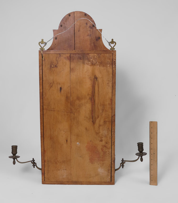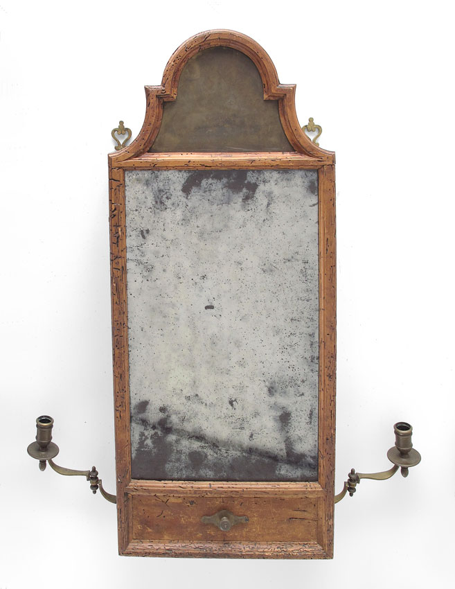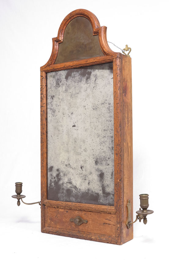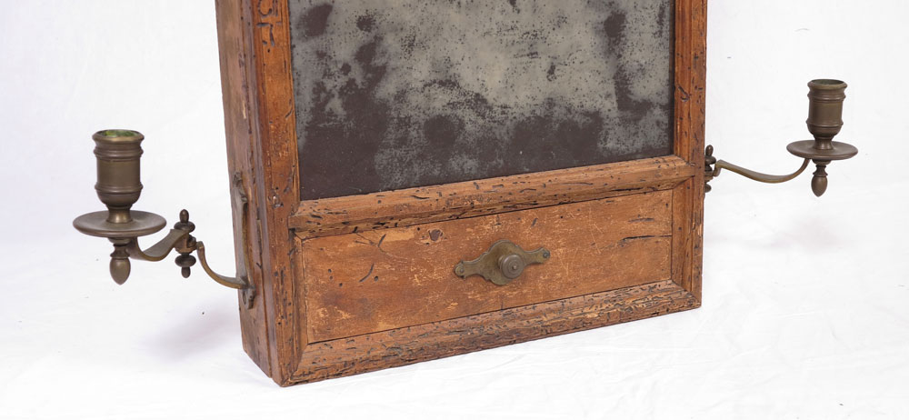 EARLY FRENCH WALL MOUNT SHAVING MIRROR: Original looking glass and brass swing arm candle holders. The hinged mirrored door opens to shelved storage. The wood has a warm patina with old worm holes. Measures approx. 32'' tall x 18'' wide x 4'' deep.