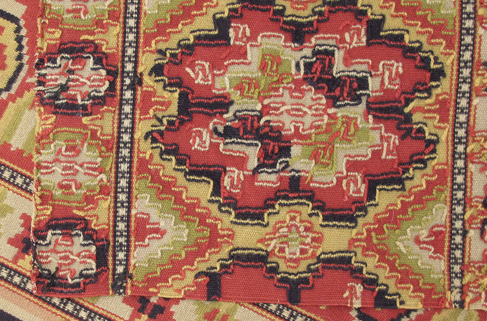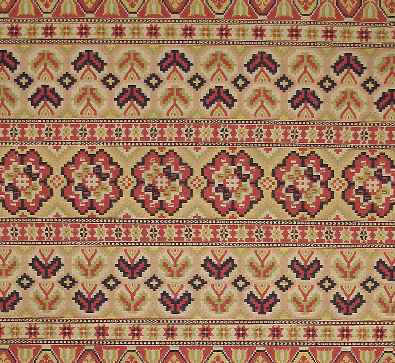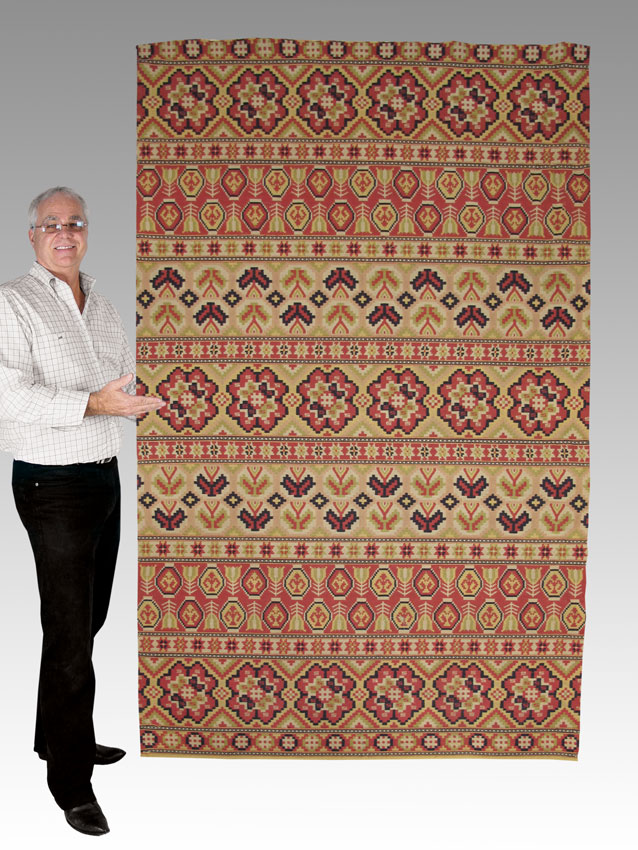 SWEDISH WALL HANGING, CIRCA 1840: 7'7'' x 4'1'', Flemish double locked hand woven tapestry of wool and linen, geometric patterns with tulip motif. Sold with interesting write up about the history of tapestries of Sweden.
