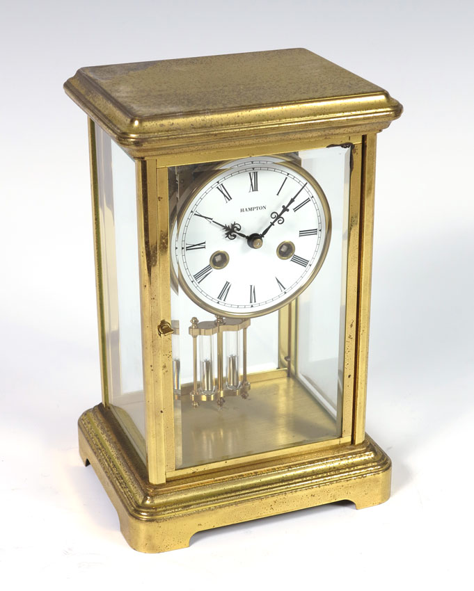 HAMPTON DOUBLE BELL REGULATOR CLOCK: Brass case with beveled glass sides, porcelain dial marked Hampton. Mercury pendulum, double bell German time and strike movement. Key and pendulum in office. 11'' h. x 7 1/4'' x 6''.
