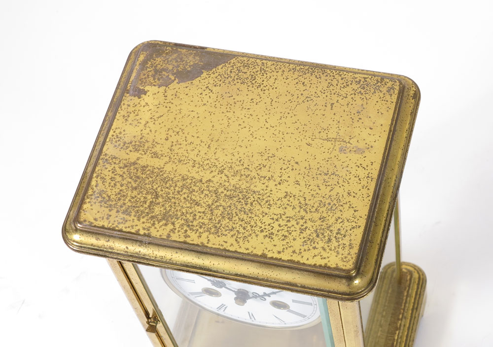 CONDITION: Note spotting to brass finish. Shippers note pendulum contains mercury. Currently running however not guaranteed to continue.