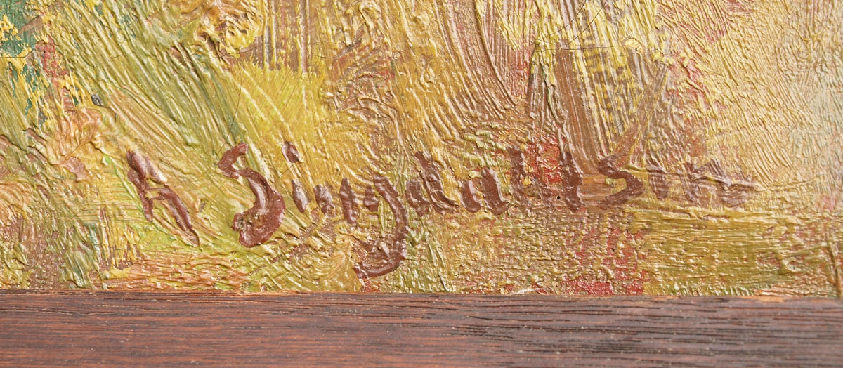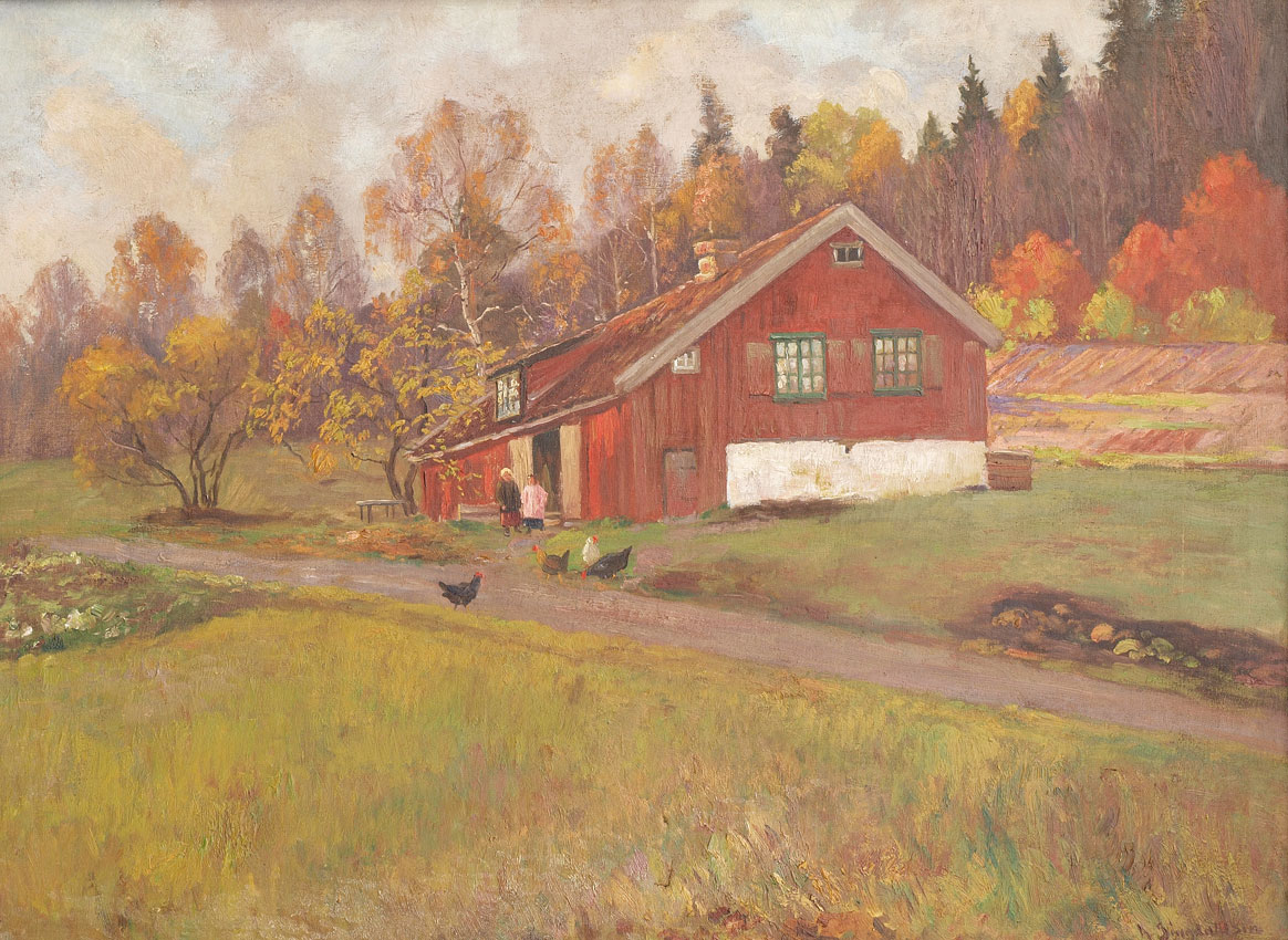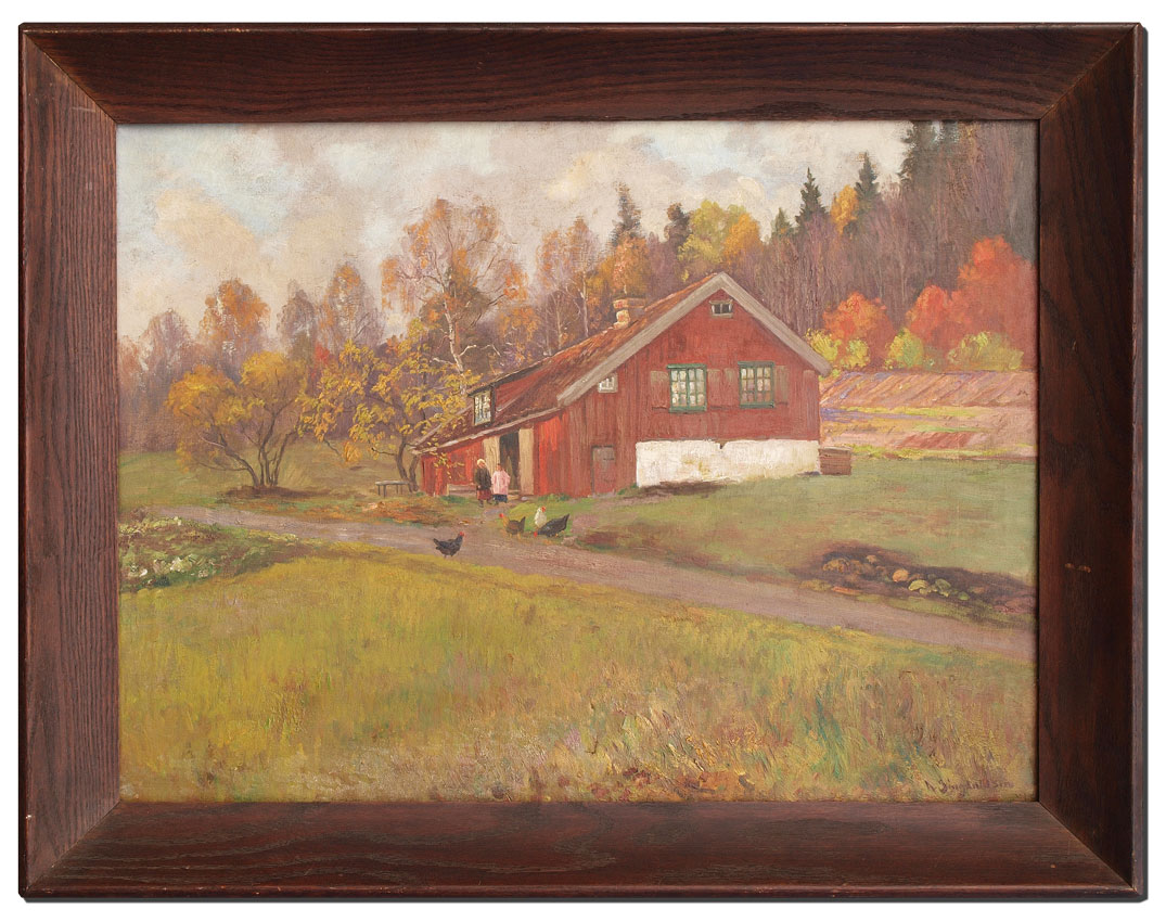 SINGDAHLSEN, Andreas, (Norwegian, 1855-1947): Autumnal Farm Scene, red barn with chickens, OIL/Canvas, 23 1/2'' x 27 1/2'', signed lower right, wood frame 28 3/4'' x 36 3/4''.