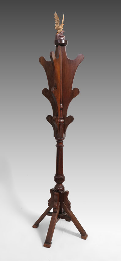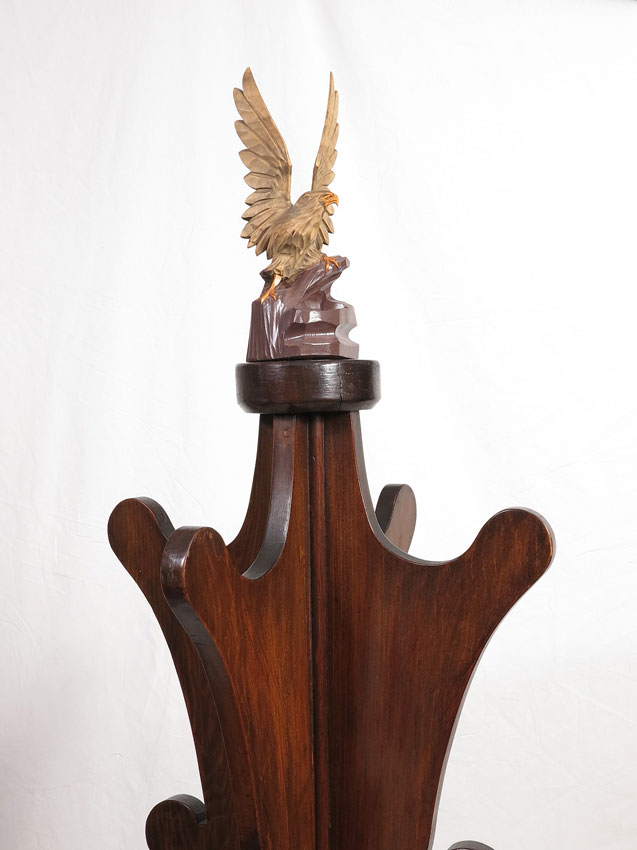 CARVED VICTORIAN HALL TREE: 12 curved arms, turned body on 4 splayed legs. Later added removable eagle finial. Overall 81 3/4'' h. x 22 1/2''.