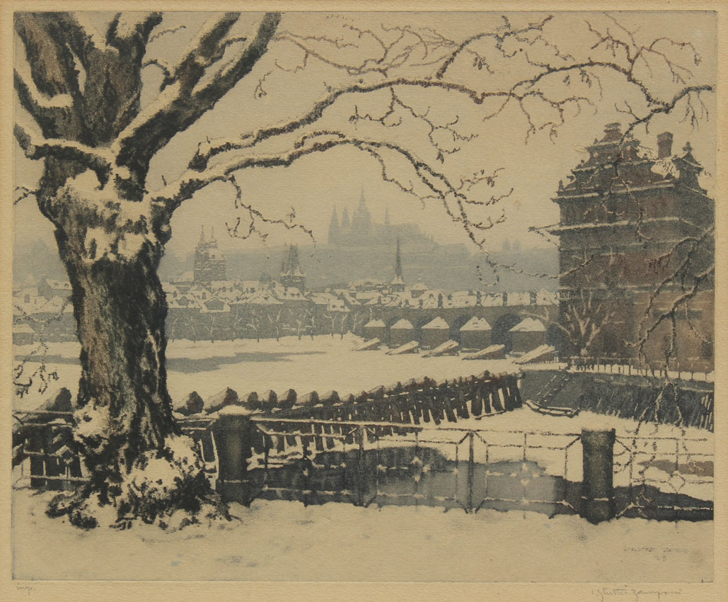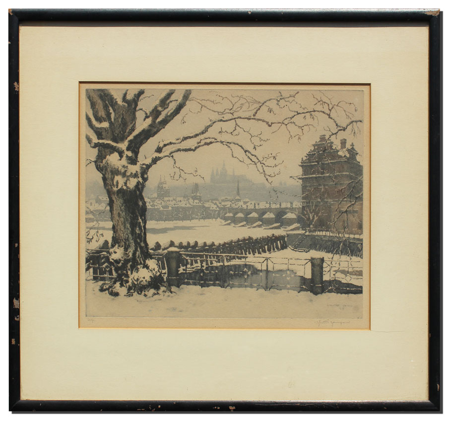 STRETTI-ZAMPONI, Jaromir (Czechoslovakian, 1802-1959): Vast Cityscape of Snow Covered Buildings, Etching/Aquatint, sight size 10 1/2'' x 12 3/4'', pencil signed lower right, also signed in the plate lower right, dated 1915, original black frame with wear, 17 1/4'' x 19''.