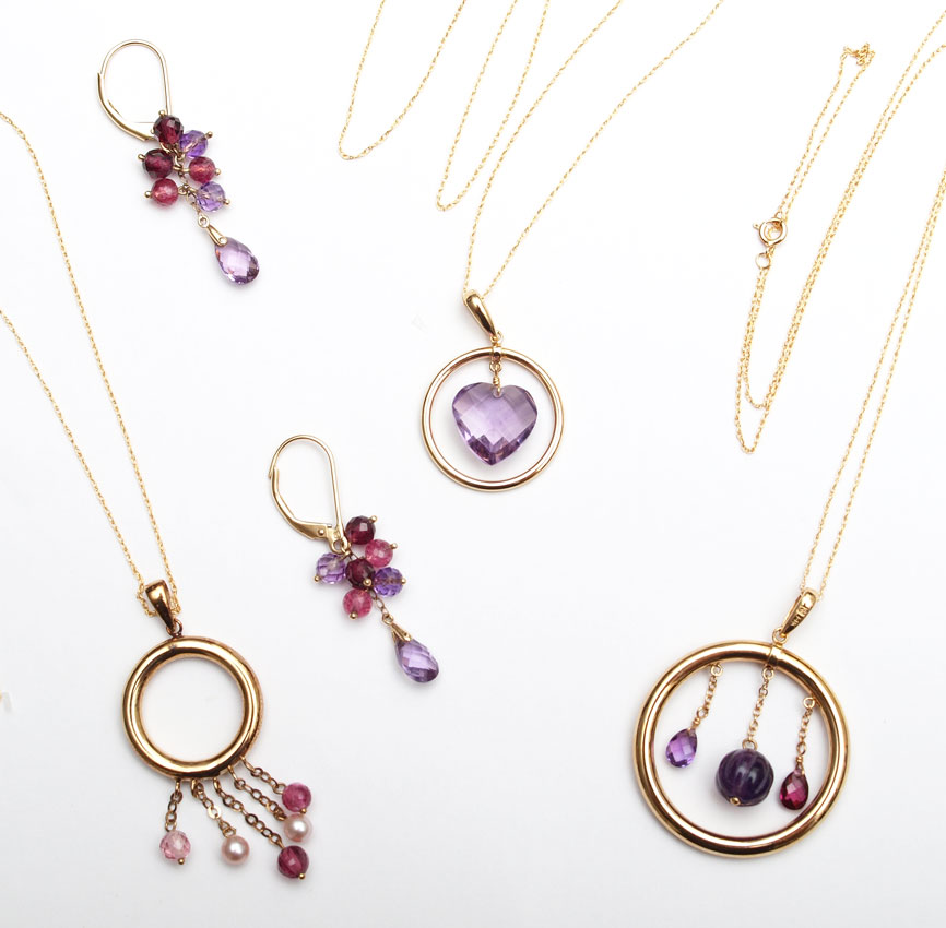 4 PIECE LORENZO 14K GOLD NECKLACES AND EARRINGS: 1) TOURMALINE NECKLACE 14K yellow gold circle pendant with hanging chain containing faceted pink tourmaline beads and cultured pearls. 14K 16'' fine rope chain. Weight: 2.0 grams. 2) AMETHYST NECKLACE 14K yellow gold circle pendant with hanging faceted and bead shaped amethysts. 14K 16'' fine rope chain. Weight: 2.8 grams 3) 14K TOURMALINE & AMETHYST EARRINGS: 14K yellow gold earrings containing faceted and bead shaped amethysts and tourmaline. Wire and lever back closures. 14K 16'' fine rope chain. Weight: 3.1 grams. 4) 14K 3.00 CT. HEART AMETHYST PENDANT& CHAIN: 14K yellow gold pendant contains one faceted heart shaped amethyst. Weight; 3.00 Ct. Approx. 14K yellow gold 16'' fine rope chain. Weight: 2.6 grams. 14K yellow gold pendant contains one faceted heart shaped amethyst. Weight; 3.00 Ct. Approx. 14K yellow gold 16'' fine rope chain. Weight: 2.6 grams TOTAL GOLD weight: 10.4 grams.