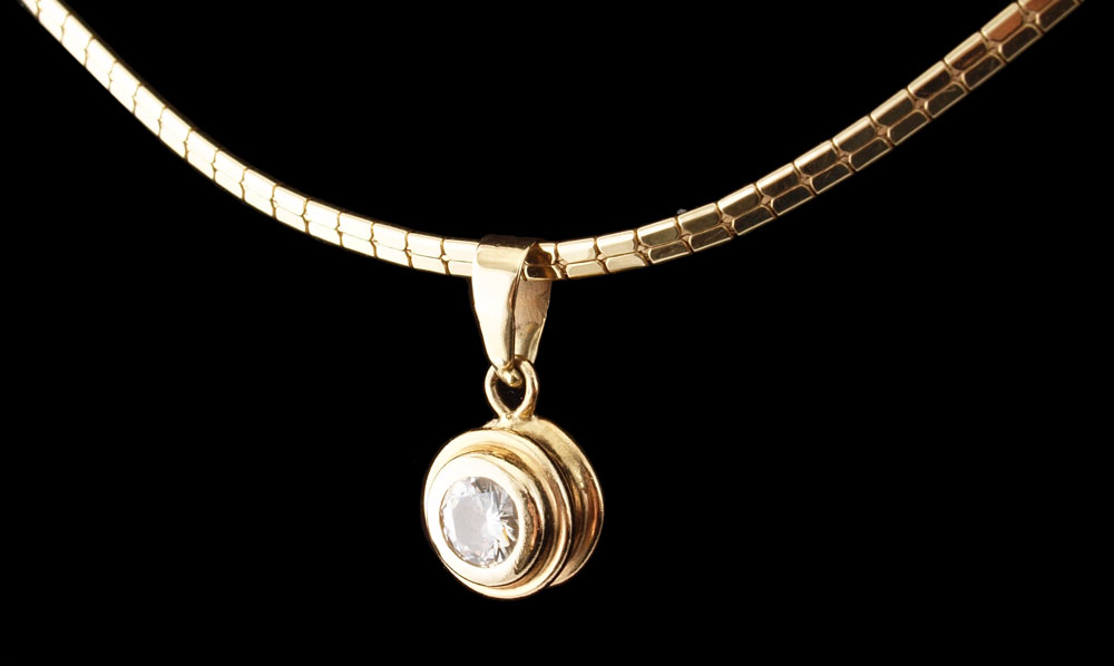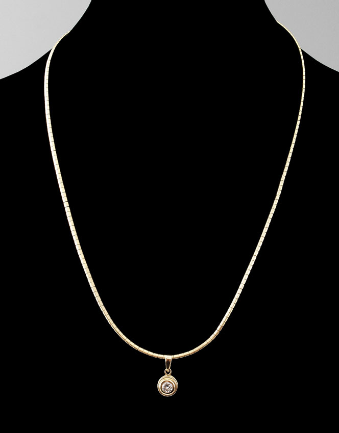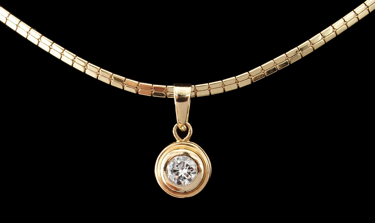 .33 CT DIAMOND SOLITAIRE PENDANT NECKLACE: Round Brilliant cut diamond rated SI1 in clarity and G-H color, bezel set in 14K yellow gold. The 18'' link chain is also 14K yellow gold. Weight 13.2 grams.