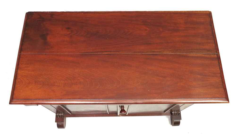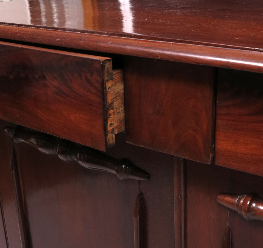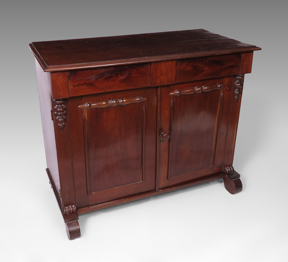 EMPIRE MAHOGANY SERVER: 2 drawers over 2 doors with applied carved decoration on shaped front feet. 37 1/4'' h. x 45 1/4'' x 22 1/2''