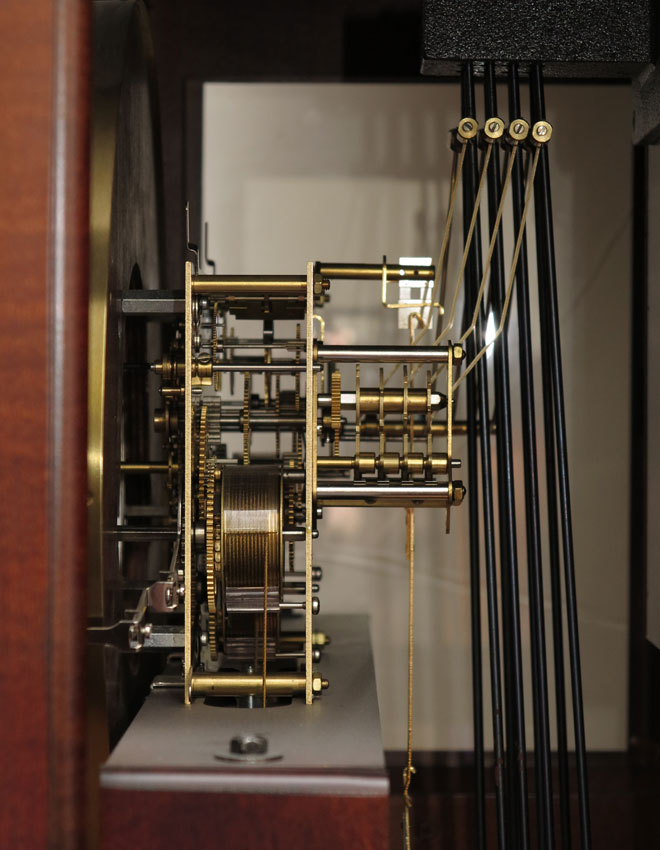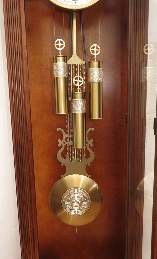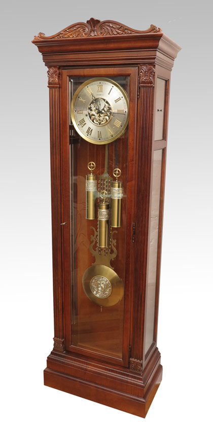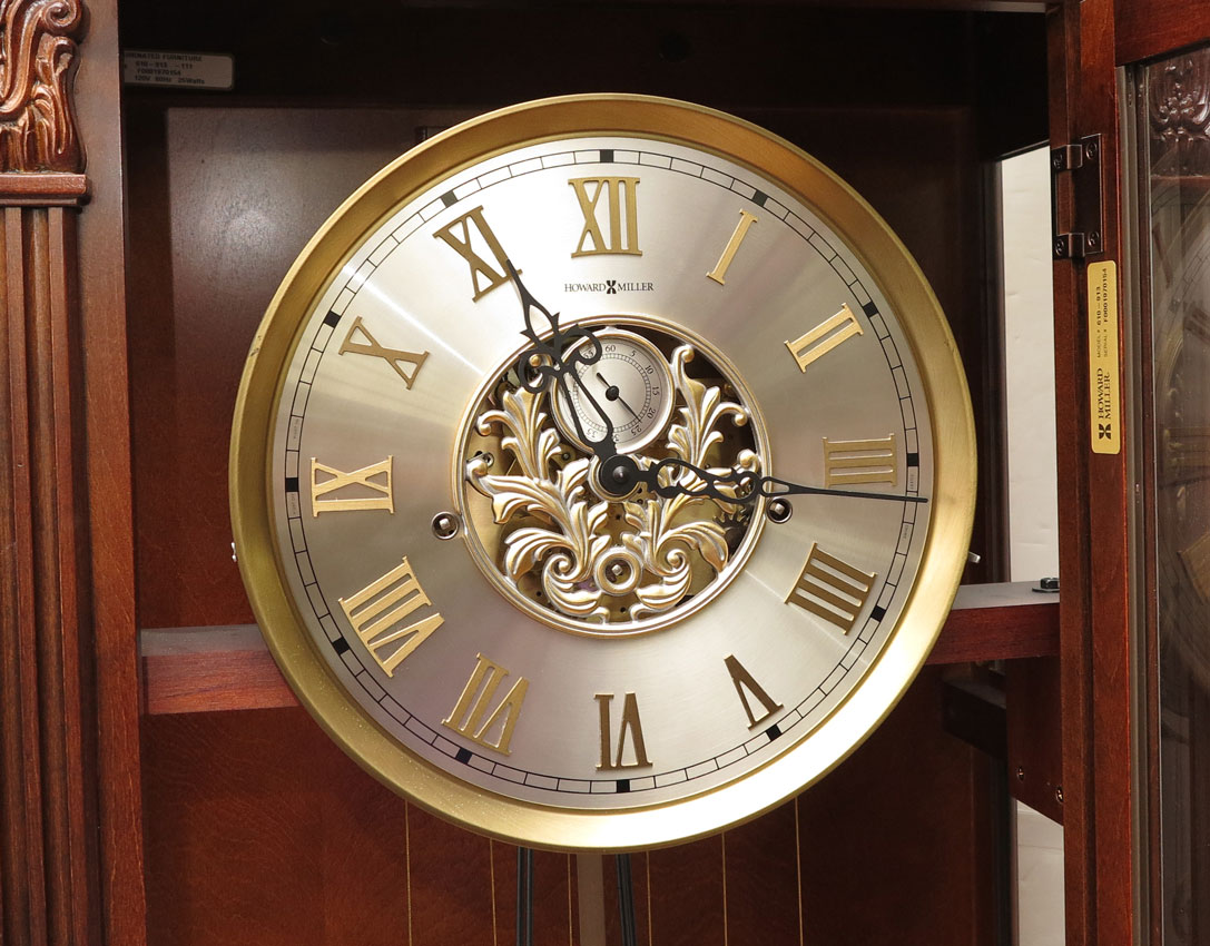 CARVED HOWARD MILLER GRANDFATHER CLOCK: Carved crest with carved and fluted applied columns on either side of case, mixed metal face with secondary second hand, triple weight key and pendulum movement, crank and key in office, measures 83'' h. x 27''x 14''.