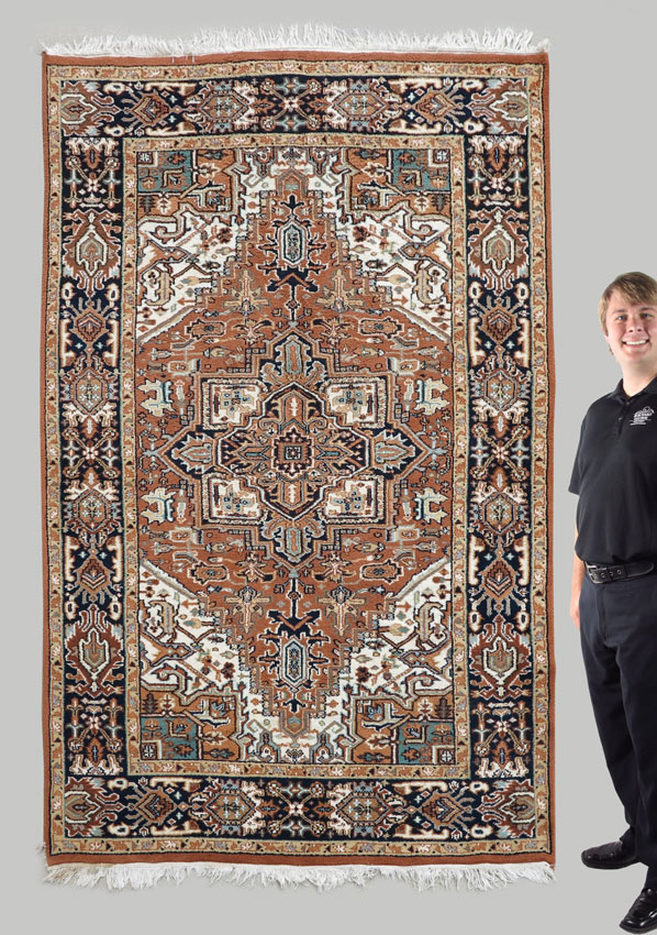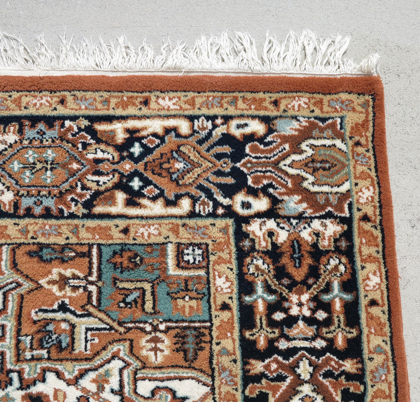 MODERN INDO-PERSIAN HAND KNOTTED WOOL RUG, 5' 8'' x 8' 9'': This rug has a traditional Persian Heriz design combined with very nontraditional colors. There is the large central medallion with its attendant spandrels but in colors that include a pale blue, black, white, and a caramel/beige. The body of the field is also caramel/beige with white corners and the main border has a black ground. The field, as well as the border, are covered with various geometric motifs that look like parts of the central medallion. This looks like a more masculine rug that would go well in a study, office, or man-cave. Condition is good.