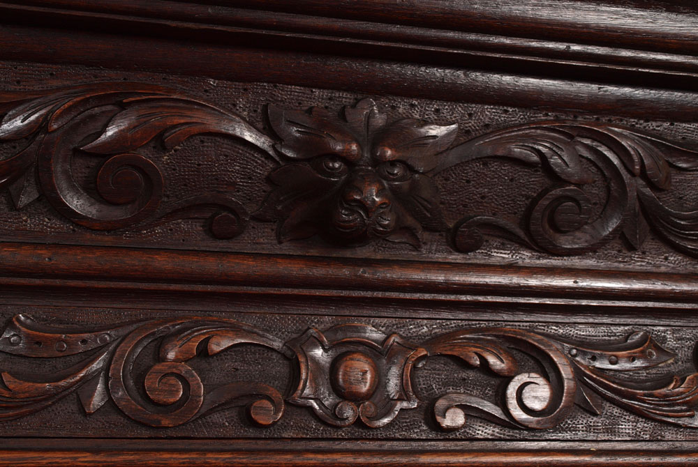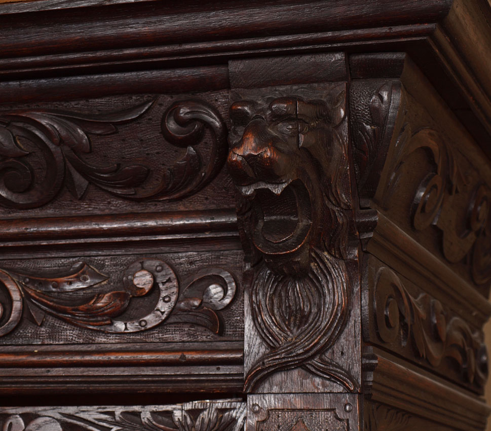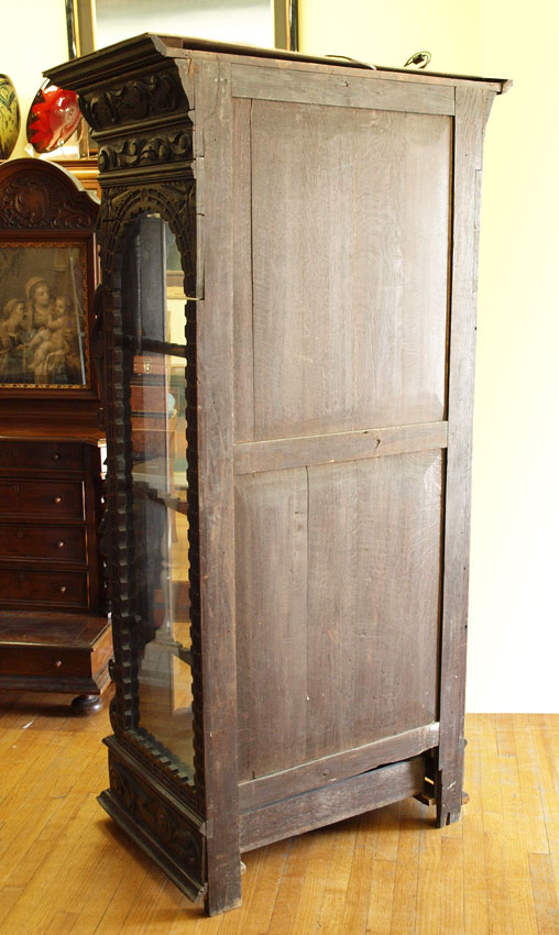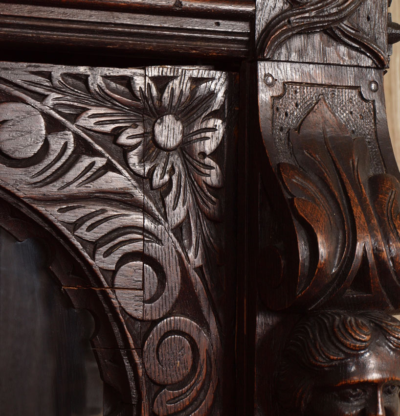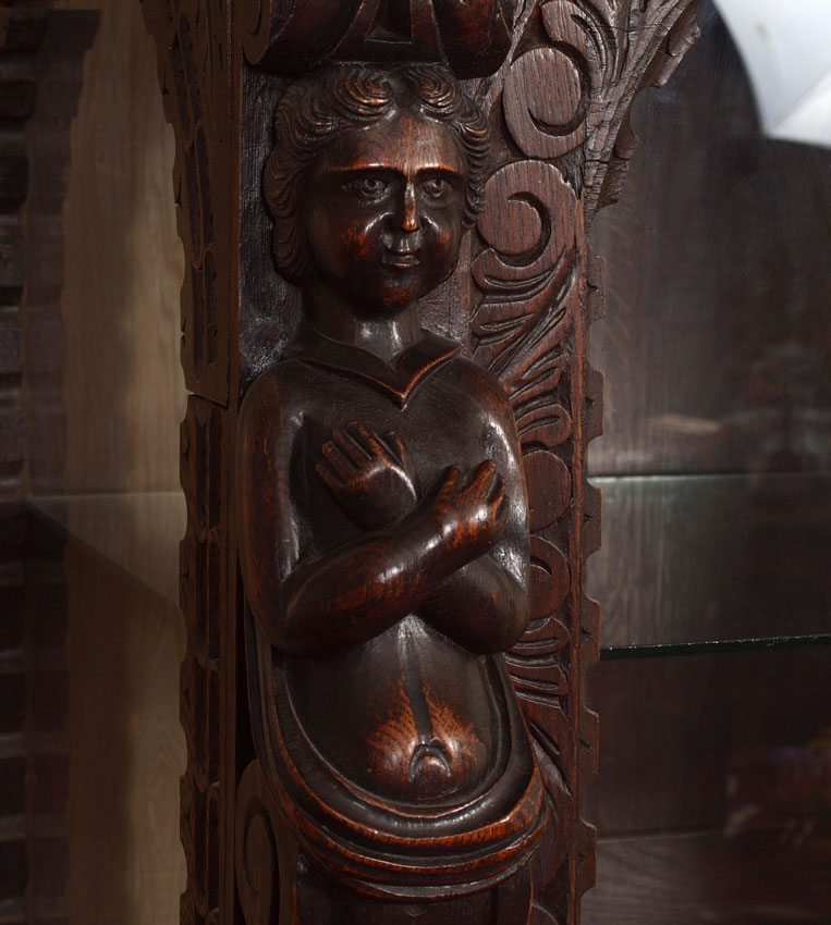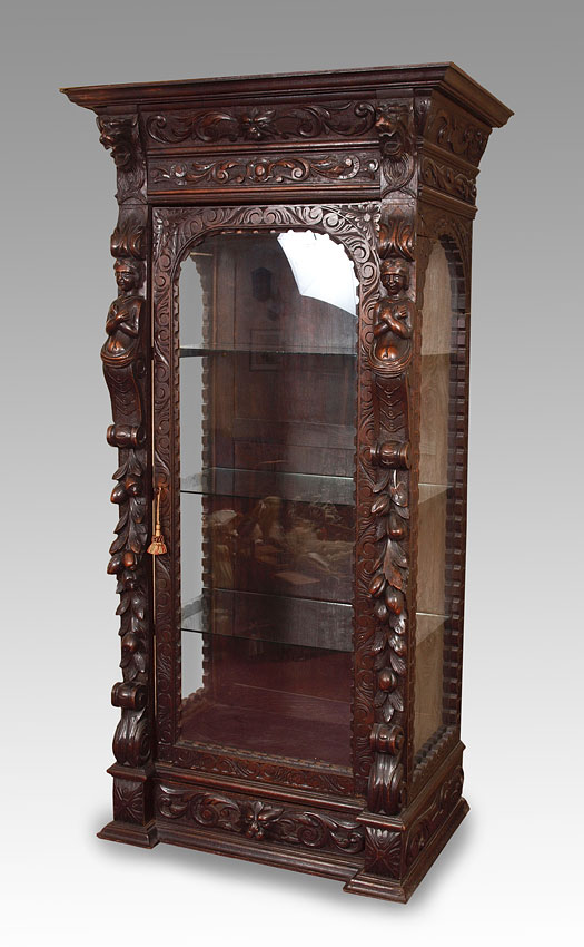 EARLY CARVED FIGURAL GERMAN CABINET: Profusely carved with Northwind masqueron, lion busts, figural maidens, foliate and scroll motifs. Illuminated interior with 3 glass shelves. Measures 79'' h. x 40'' x 26''.