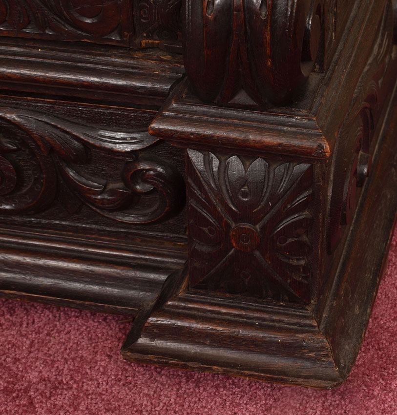 CONDITION: Note very top is replacement, chip to top corner, age splits in sides and door, evidence of prior woodworm activity.