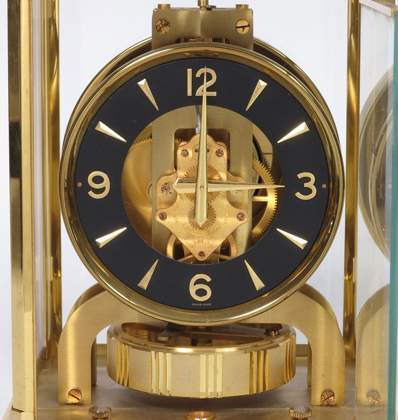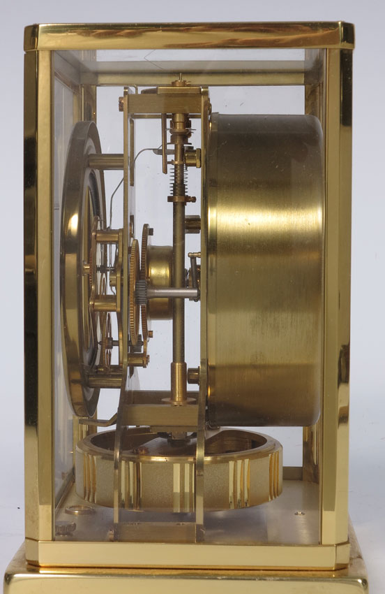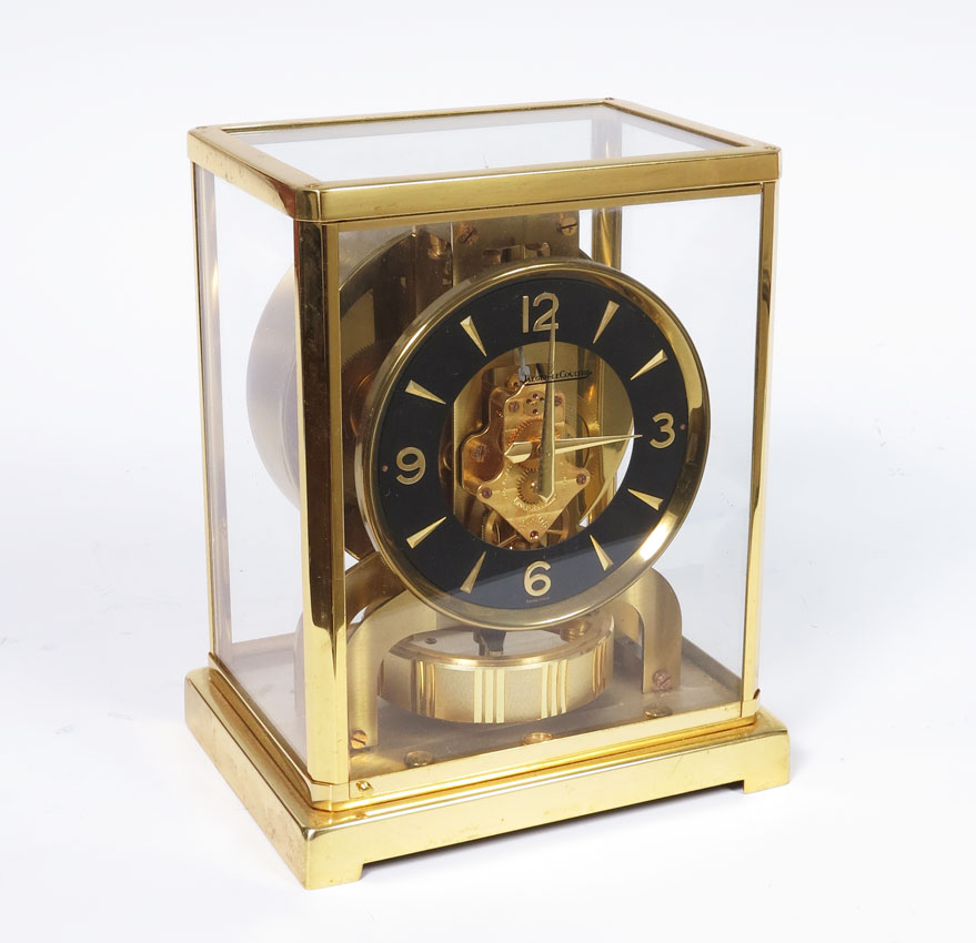 JAEGER - LECOULTRE ATMOS CLOCK: Brass case with black dial, marked Jaeger-LeCoultre on glass and movement. Serial number 354219, dates to the early 1970's. 8 3/4'' x 7'' x 5 1/2''.