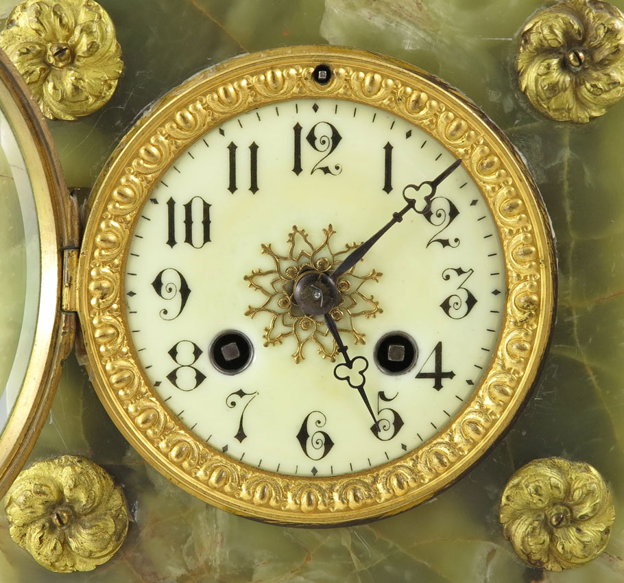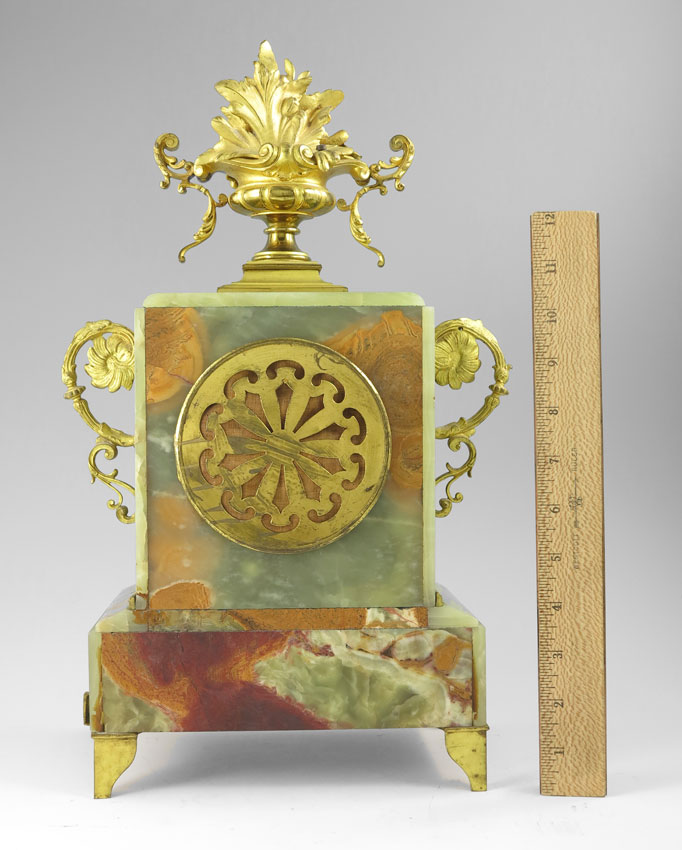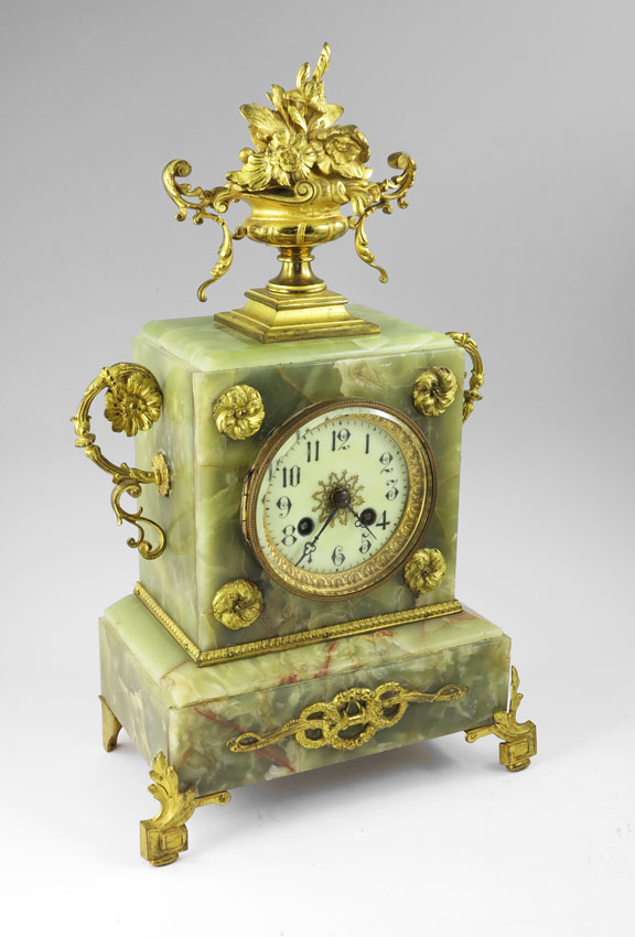 FRENCH ORMOLU AND GREEN ONYX MANTLE CLOCK: Floral urn final and scroll handle with other applied decoration on green onyx case. Porcelain dial with Arabic numeral, unmarked French time and strike movement. Key and pendulum in office. Measures 16 1/2'' h. x 10'' x 5 1/2''.