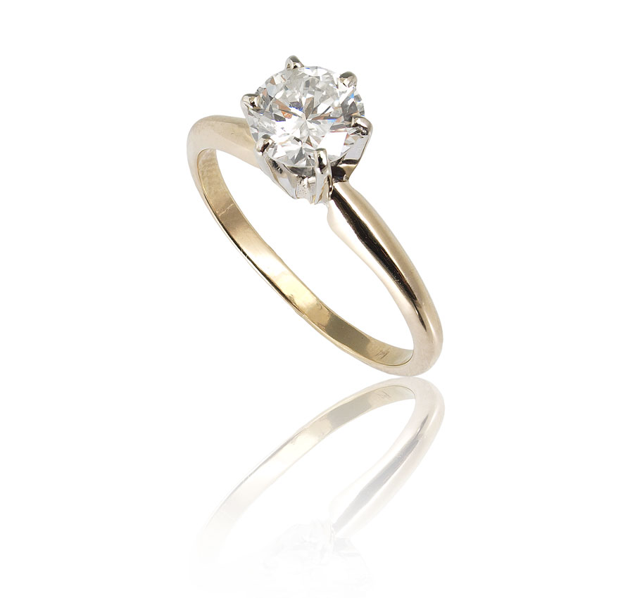 DIAMOND SOLITAIRE RING: An approx. .70 Ct round brilliant diamond in a 14K yellow gold Tiffany style setting. The diamond is rated I1 clarity and O-P color. Weight: 2 grams. Size: 4.5. Sold with current Florida Diamond Appraisers GIA graduates appraisal for $1,850.