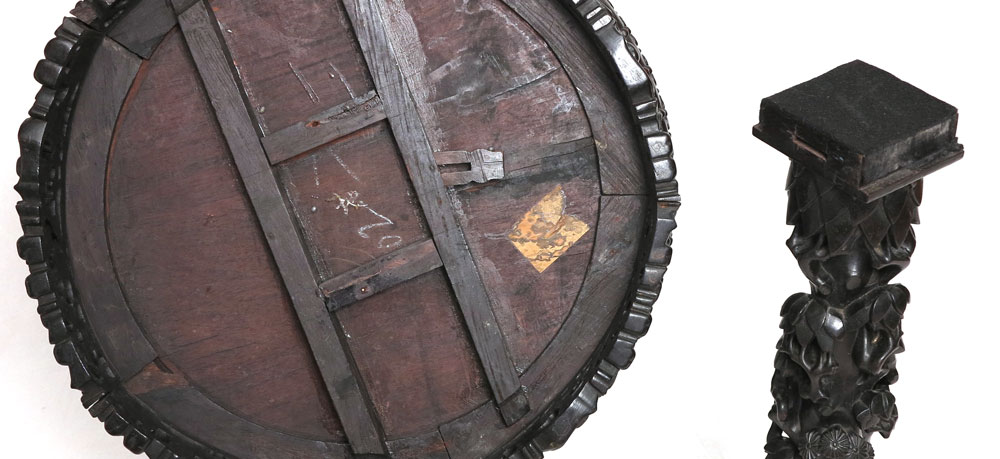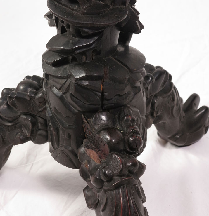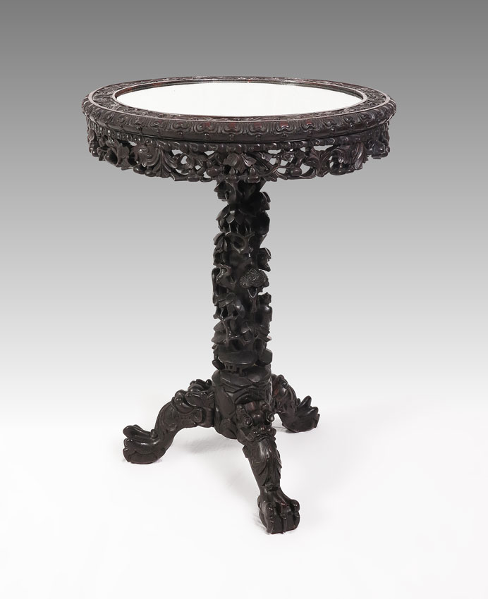 ORIENTAL CARVED MIRROR INSET SIDE TABLE: Carved rim with carved and pierced apron. Floral motif body with figures, figural foo dog masqueron legs ending in paw feet. 32 1/2'' h. x 23 1/2'' dia.
