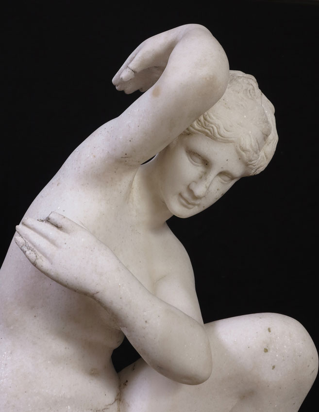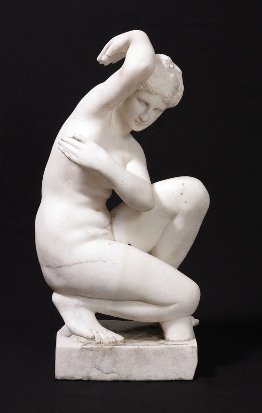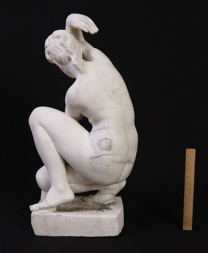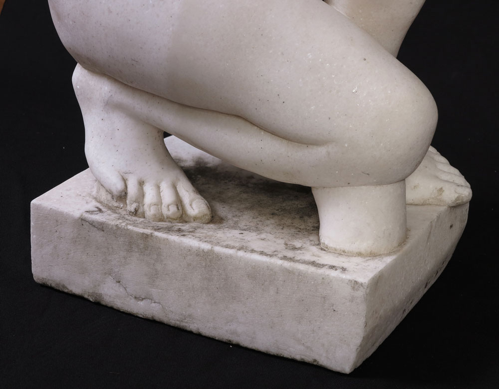 A LARGE ITALIAN CARVED MARBLE FIGURE OF THE CROUCHING VENUS: Approx. 33''h. x 17'' x 13'', no visible signature.