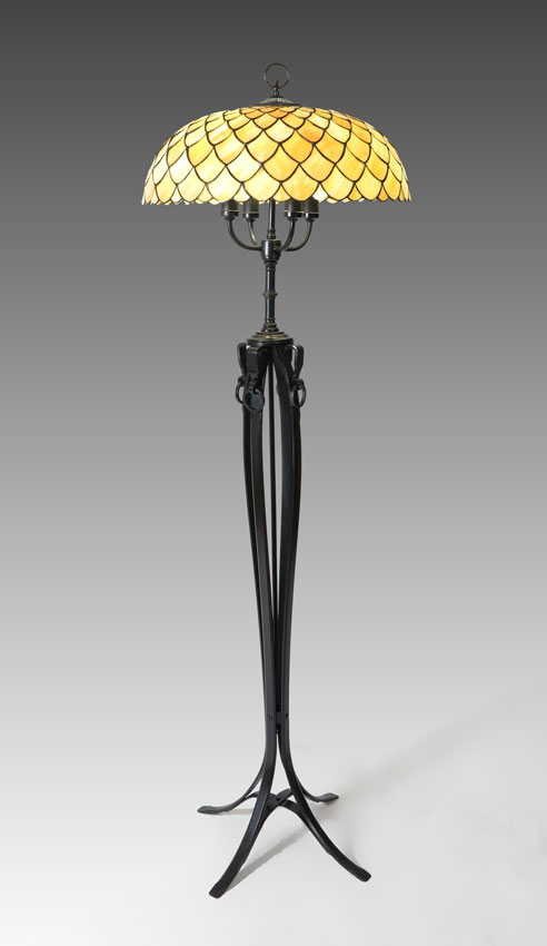 1940-50s WROUGHT IRON ARTS AND CRAFTS STYLE FLOOR LAMP: 4 socket with a 20'' copper foil leaded glass ''fish-scale'' style shade, rewired for safety. Base 63'' h. x 18'', shade 6 3/4'' h. x 20''.