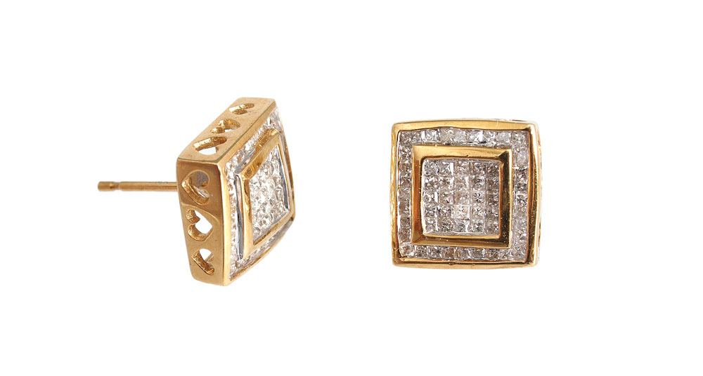 14K GOLD & DIAMOND EARRINGS: Yellow gold earrings contain 114 princess cut diamonds totaling approx. .85 Ct., rated SI-I1 in clarity and H-I in color. The diamonds are channel and invisible set. Post and nut closures. Weight: 3.8 grams.