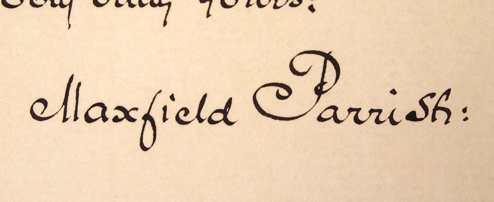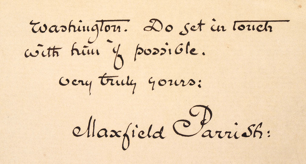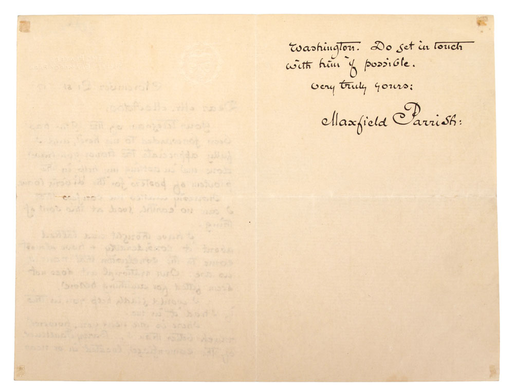 SIGNED MAXFIELD PARRISH HAND WRITTEN LETTER: Dated November 21, 1917, on embossed ''The Players, Sixteen Grammercy Park'' letterhead. Great content of Parrish rejecting to do WWI Liberty Bond posters. Letter reads ''Dear Mr. McAdoo: Your telegram of the 19th has been forwarded to me here and I fully appreciate the honor you have done me in asking my help in the problem of posters for the Liberty Loans. Honestly Makes me confess that I am no good at this sort of thing. I have thought and talked about it considerably & have almost come to the conclusion that none of are. I would gladly help you in this if I had it in me. There is one near you, however, much better than I, Barry Faulkner of the Camouflage, located in or near Washington. Do get in touch with him if possible. Very Truly Yours; Maxfield Parrish:'' Open letter measures 7'' x 9''.