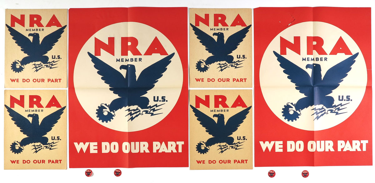 5 PIECE NEW DEAL NRA POSTERS: 5 National Recovery Administration ''We Do Our Part'' posters and store window signs. The NRA was the primary New Deal administration under Roosevelt and lasted from 1933 to 1935 when it was deemed unconstitutional. Includes 2 paper posters (28'' x 21'') and 3 cardboard store signs (14'' x 11'').