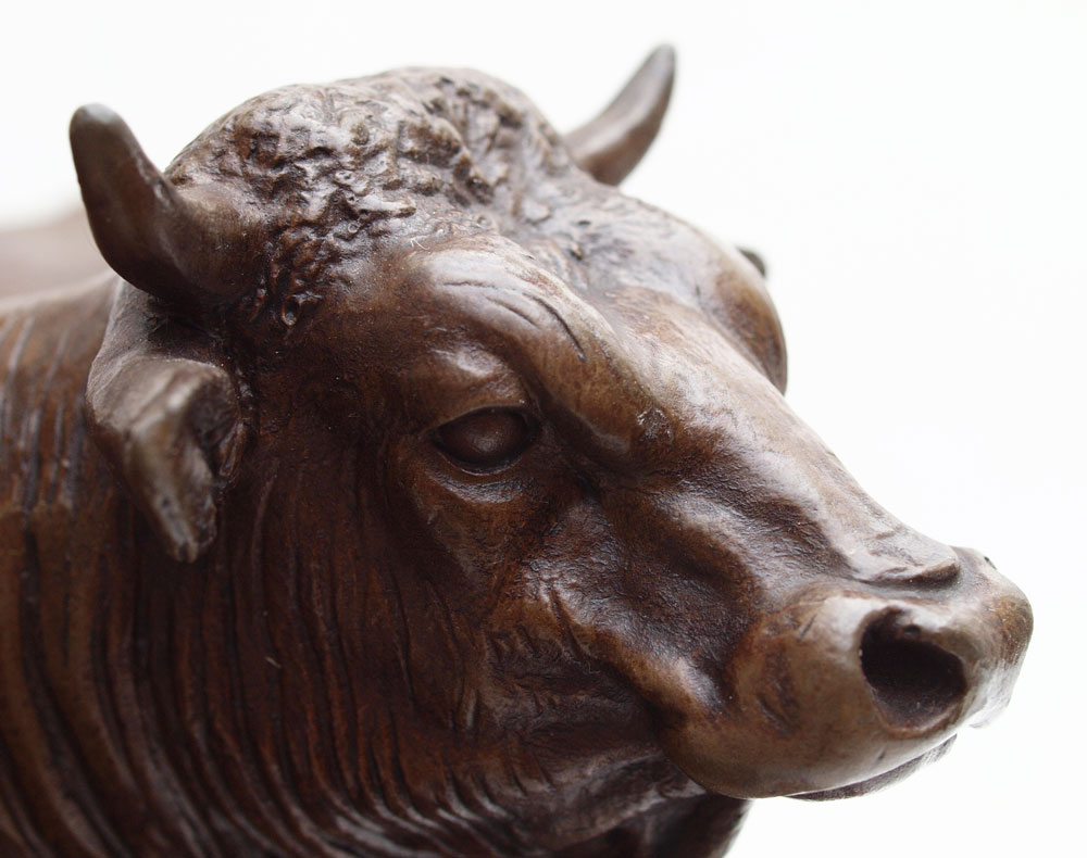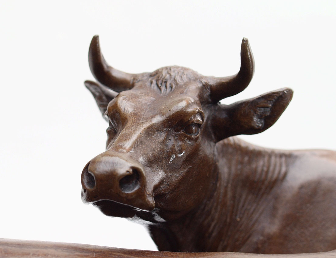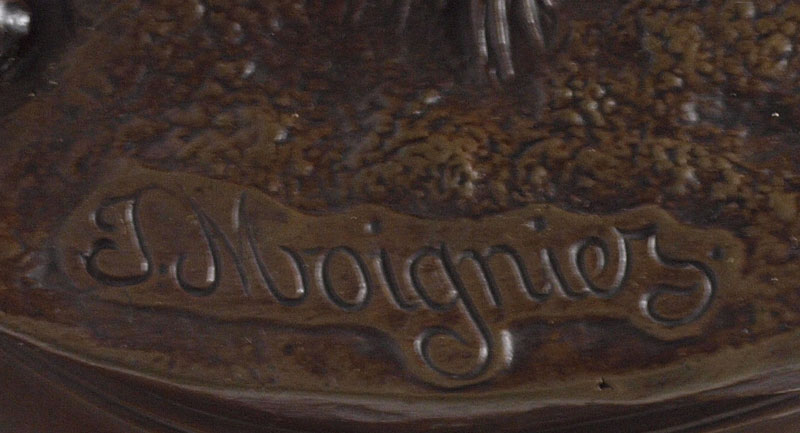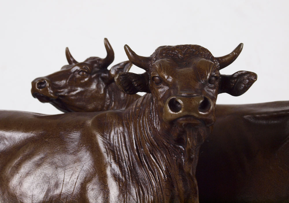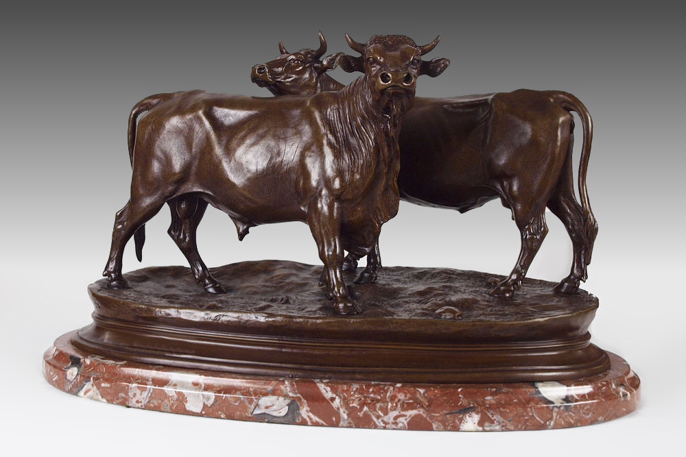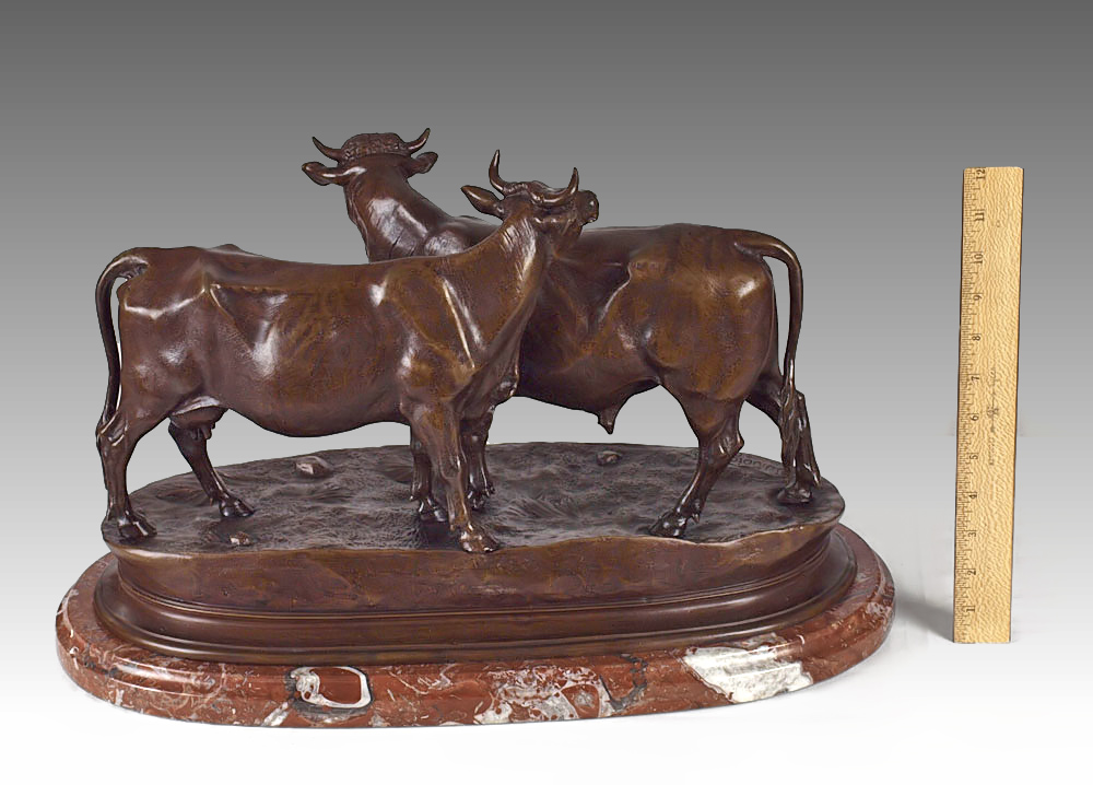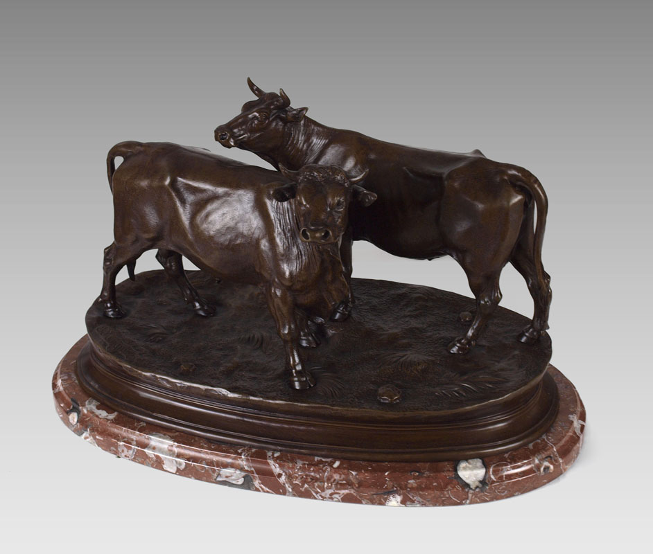 MOIGNIEZ, Jules, (French, 1835-1894): Cattle Grazing, bull and heifer, Bronze, 11''h x 18''w, variegated red marble plinth, 12''h overall, incised signature.