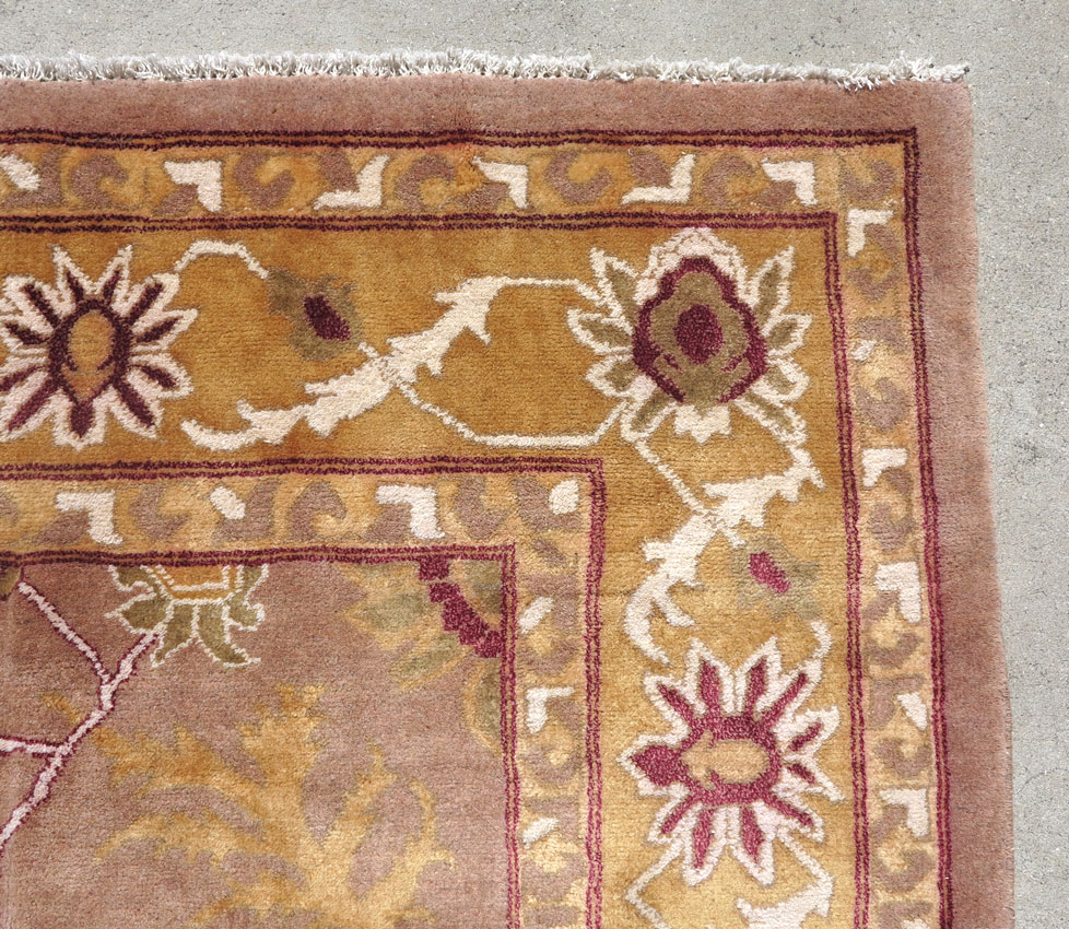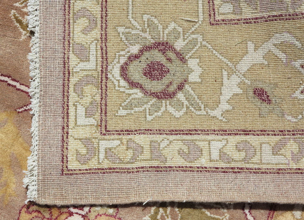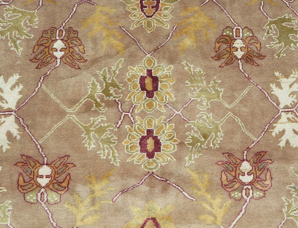 MODERN PAKISTANI HAND KNOTTED WOOL RUG, 7' x 8' 6'': This pastel hued rug comes from Peshawar in Pakistan. It has a soft sandy beige colored field that is covered with mostly pastel colored palmettes and leaves. There are some burgundy accents in these motifs that give the design some punch. The main border has a strong yellow gold ground with crab-like motifs joined by white vines and leaves. The color palette of the rug lends itself to modern or beach casual decors. Condition is good.