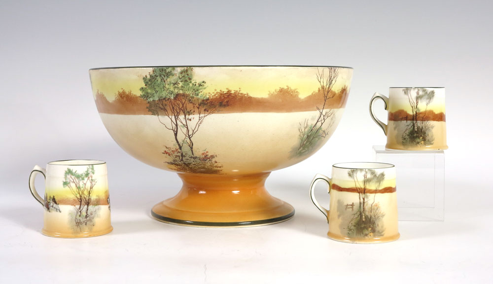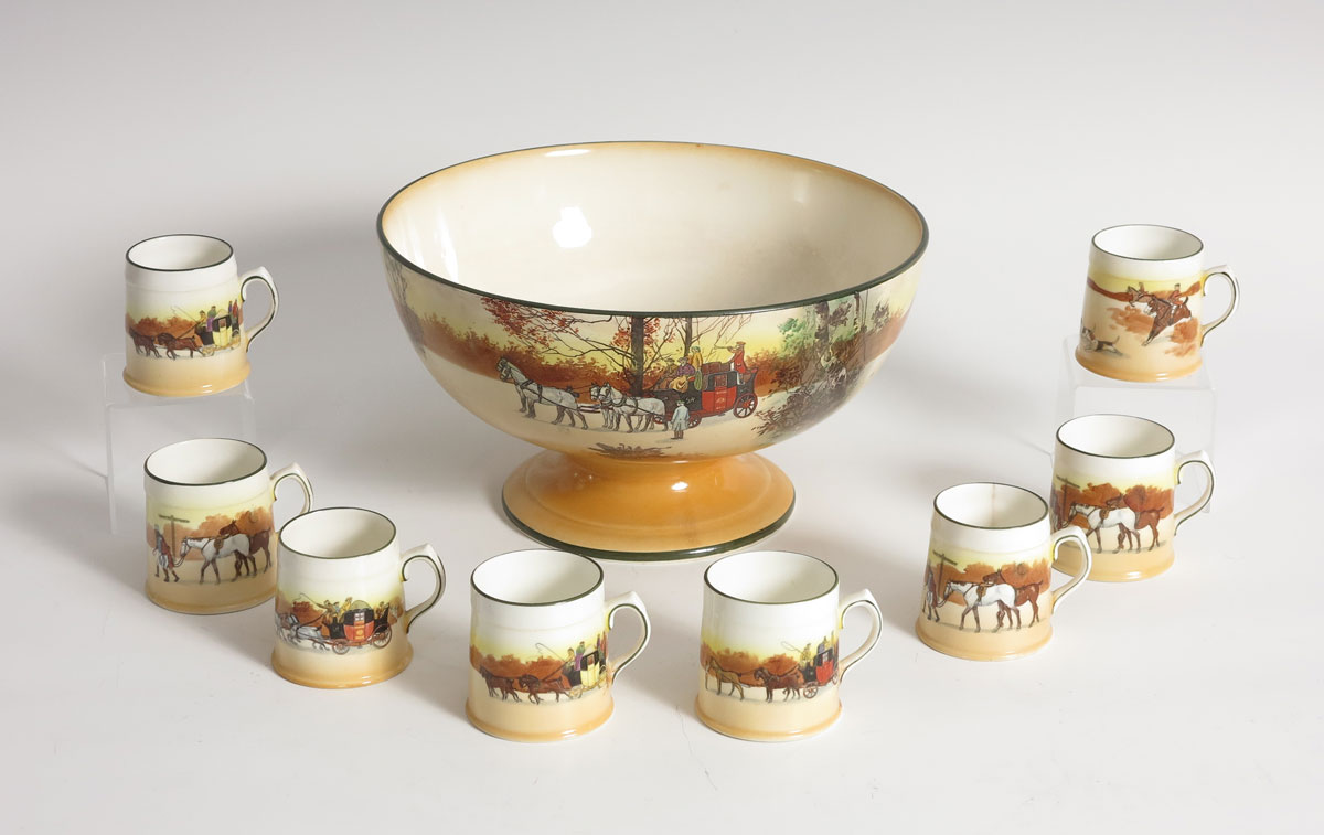 ROYAL DOULTON COACHING DAYS PEDESTAL BOWL & 8 MUGS: Images of mail carriers and other horse scenes, bowl 6 3/4'' h. x 12'' x, mugs 2 3/4'' x 3 5/8''.