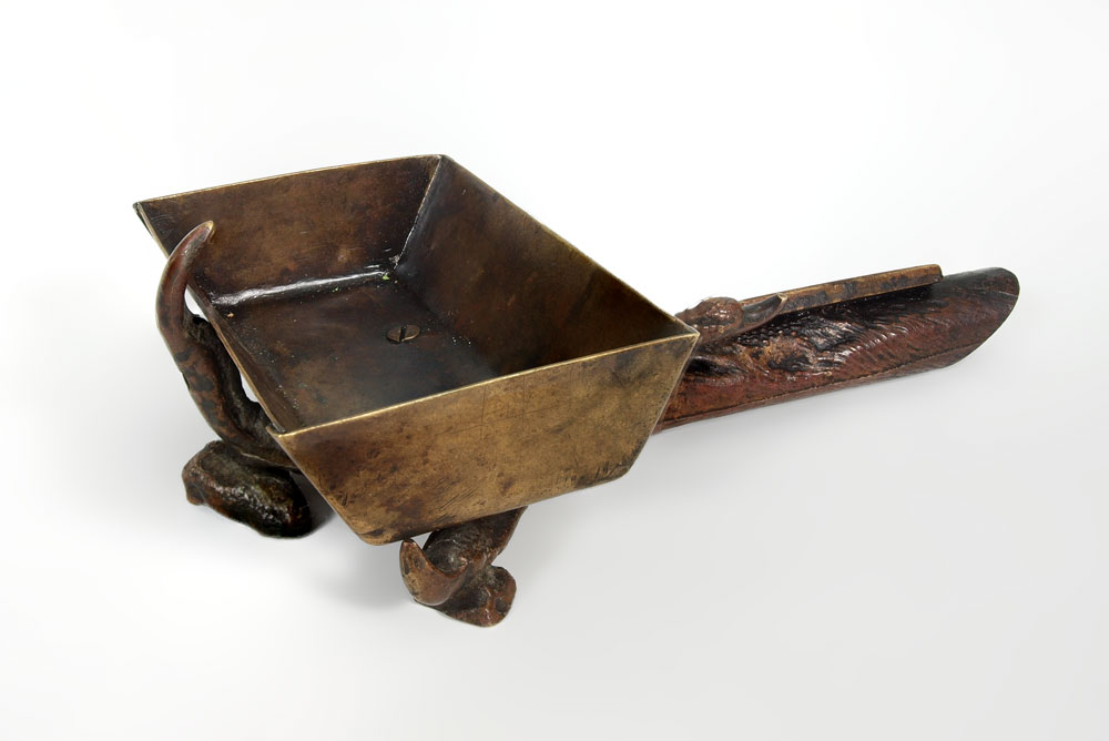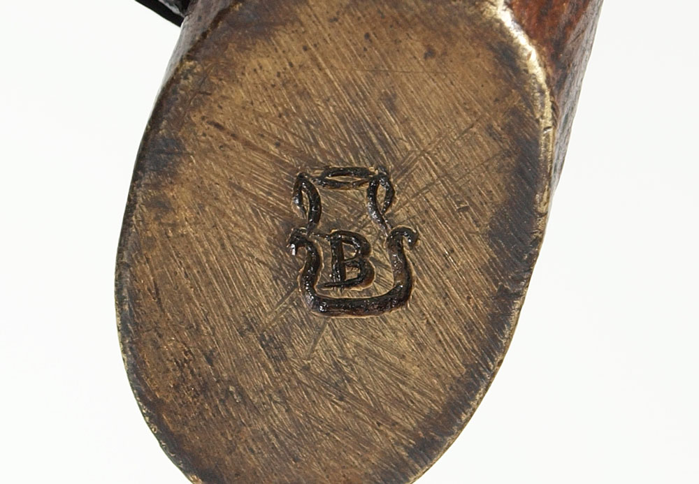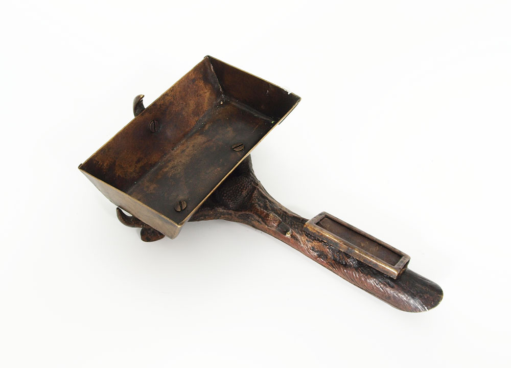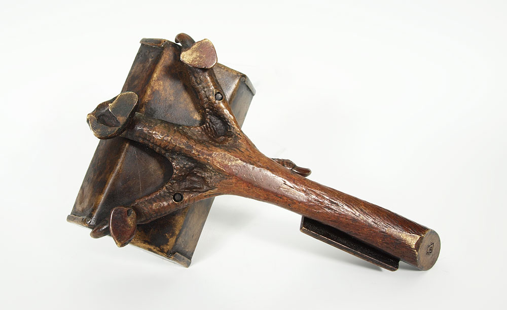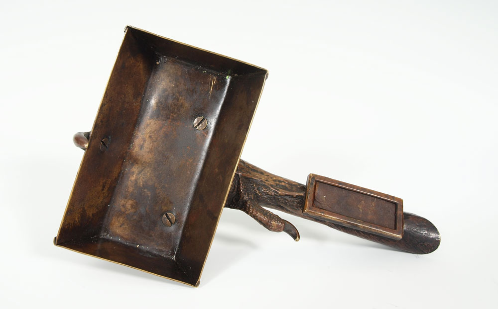 BERGMAN BRONZE TALON CLAW FORM MATCH SAFE: Franz Xavier Bergman (1861-1936). Match box in the form of a talon claw, striker in the ''leg'' handle. Impressed B in vase mark. 6 1/4''l. The box is 2 1/4'' x 3 1/2''.