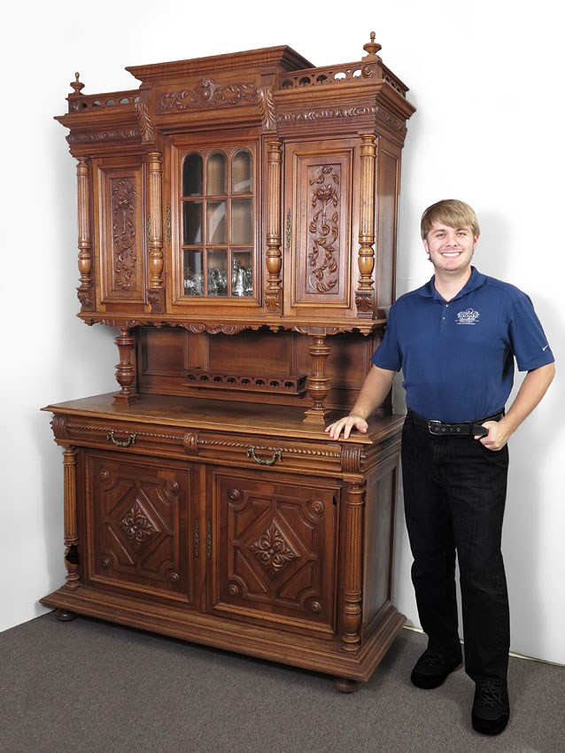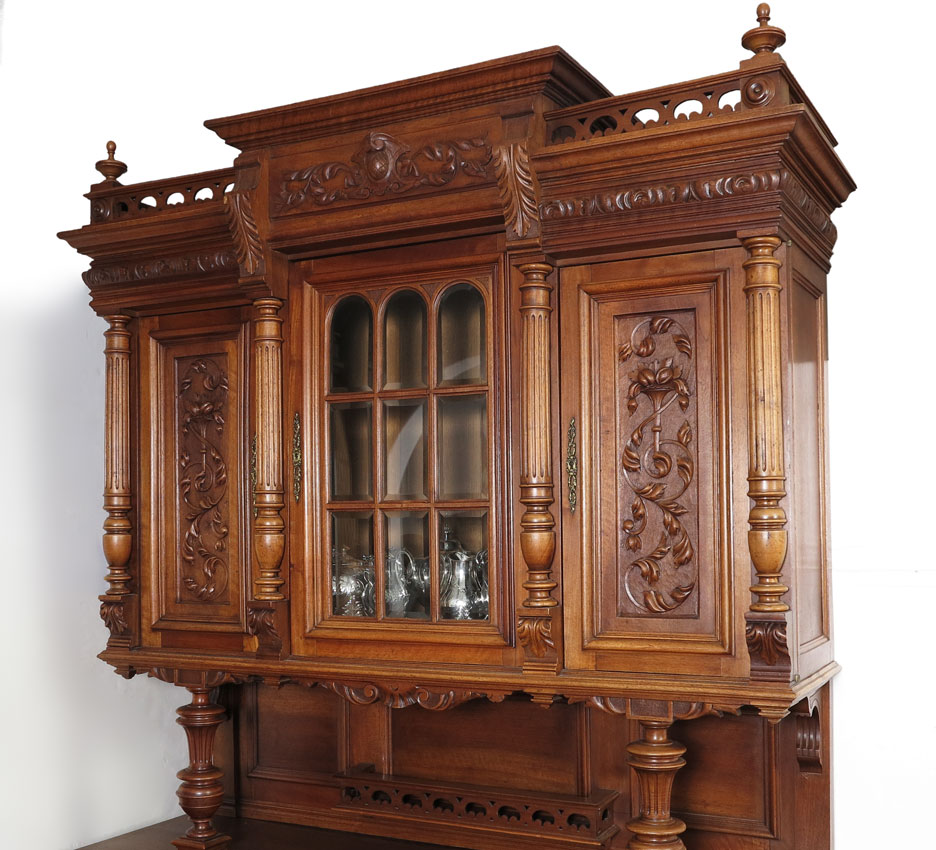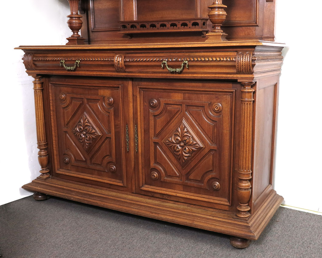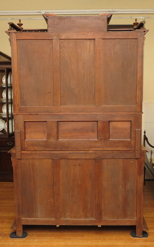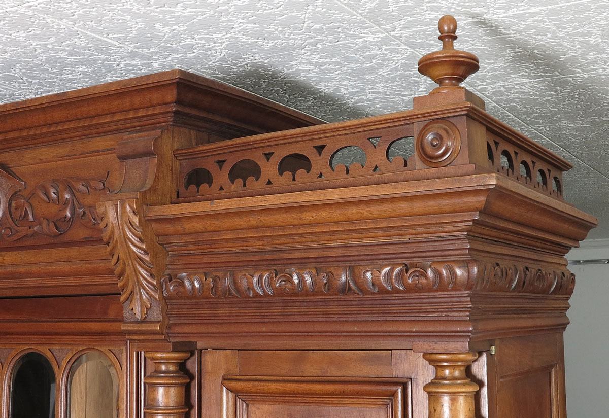 BELGIAN CARVED OAK COURT CUPBOARD: Carved crest surmounted by carved and pierced gallery with finial. Top section with 9 panel beveled glass central door, applied carved decoration to panels on side doors, shaped skirt. Carved and turned support columns. Base with gadroon accents, 2 half drawers over 2 doors with carved panels, 3/4 carved and fluted columns. All on bun feet. Keys in office. Measures Approx. 94'' h. x 60 1/2'' x 22 1/4''.