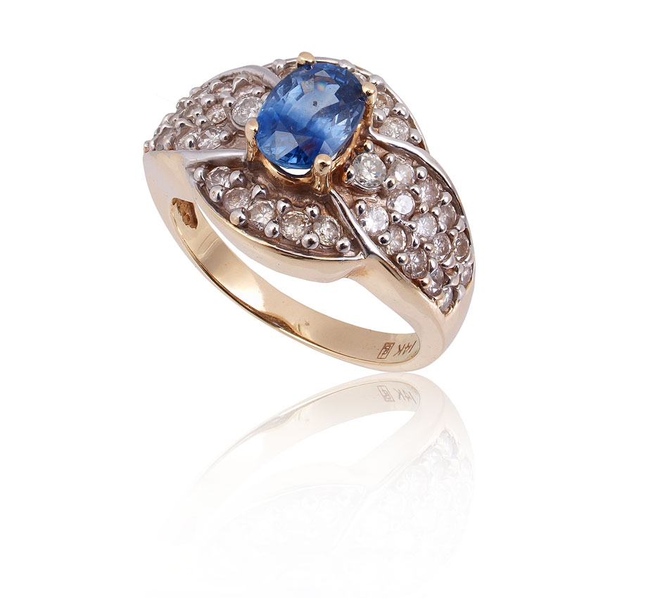 SAPPHIRE & DIAMOND RING: 14K yellow gold ring contains one oval shaped mixed cut sapphire. Weight: 1.10 Ct. Approx. VS in clarity, vB in Hue, 4 in Tone and 3-4 in Saturation. With zoning. The 38 round brilliant cut diamonds total approx. .50 Ct. Rated SI in clarity and H-I in color. The sapphire and diamonds are prong set. Weight: 6.3 grams. Size: 6